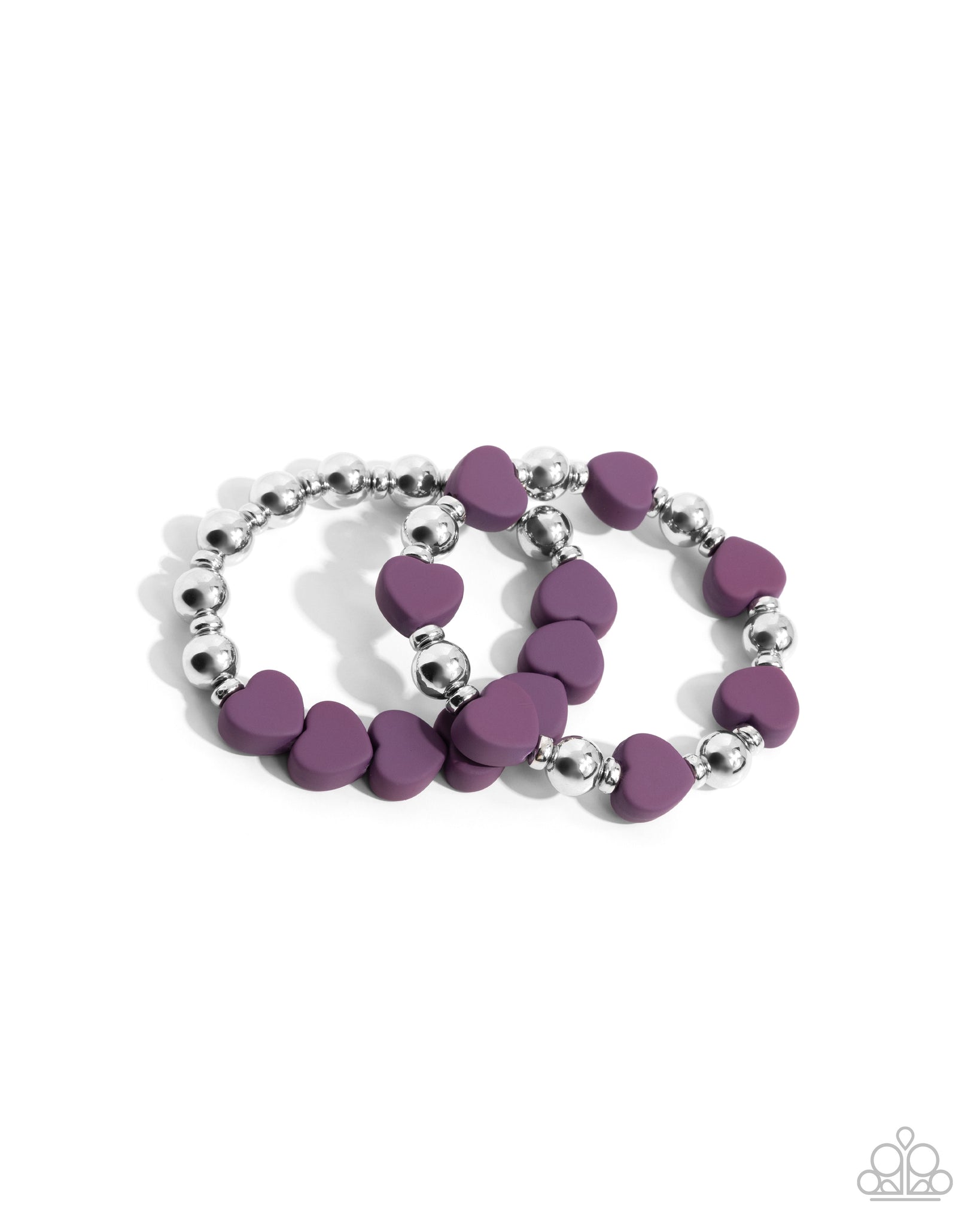 Infused along elastic stretchy bands, a collection of silver discs, Plum heart beads, and round silver beads pattern and stack atop the wrist for a heartfelt haute look.
