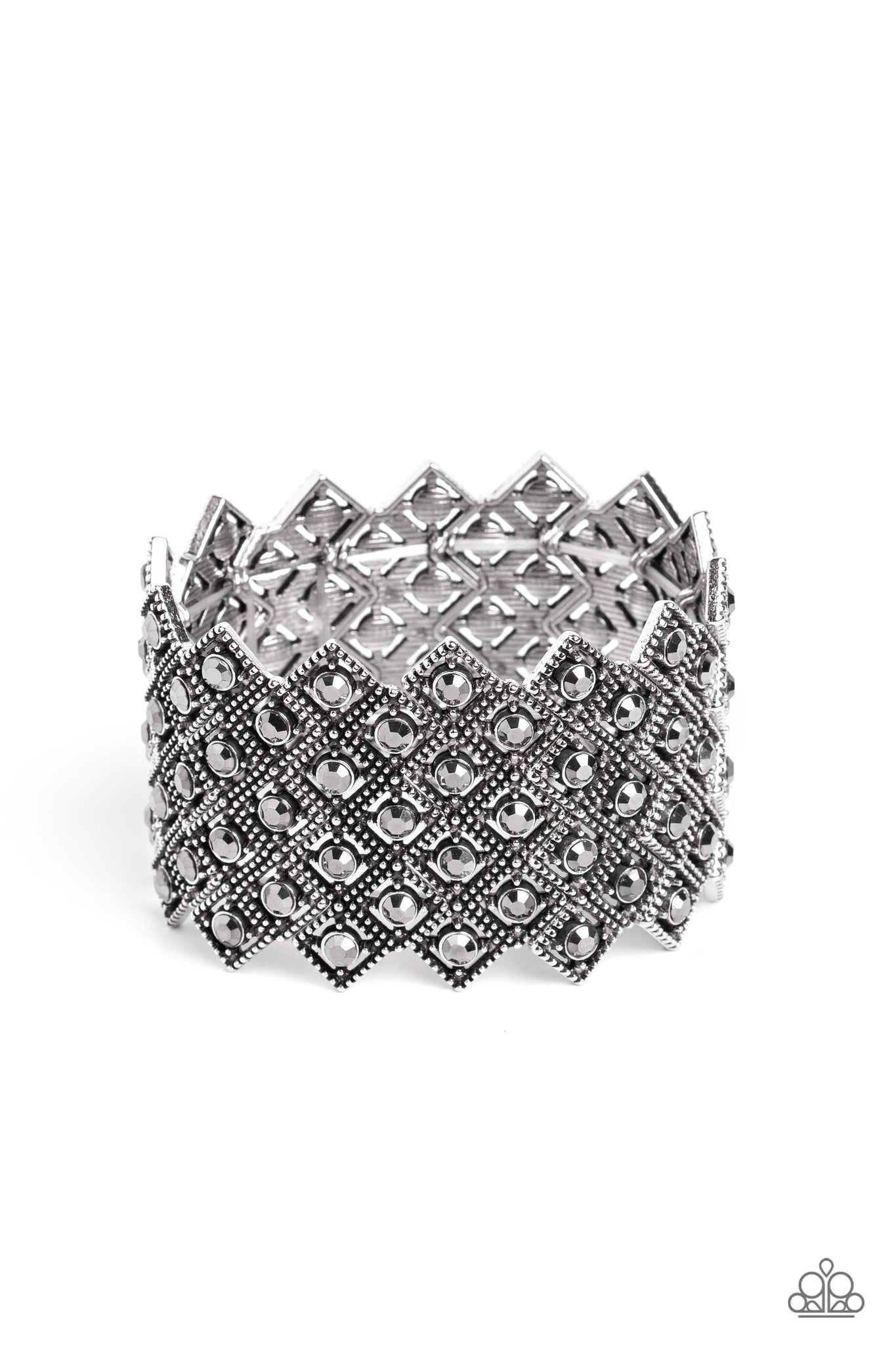 Glittery silver-studded diamond frames filled with hematite rhinestones cluster together in a geometric pattern around the wrist on elastic stretchy bands for a glitzy art deco finish.