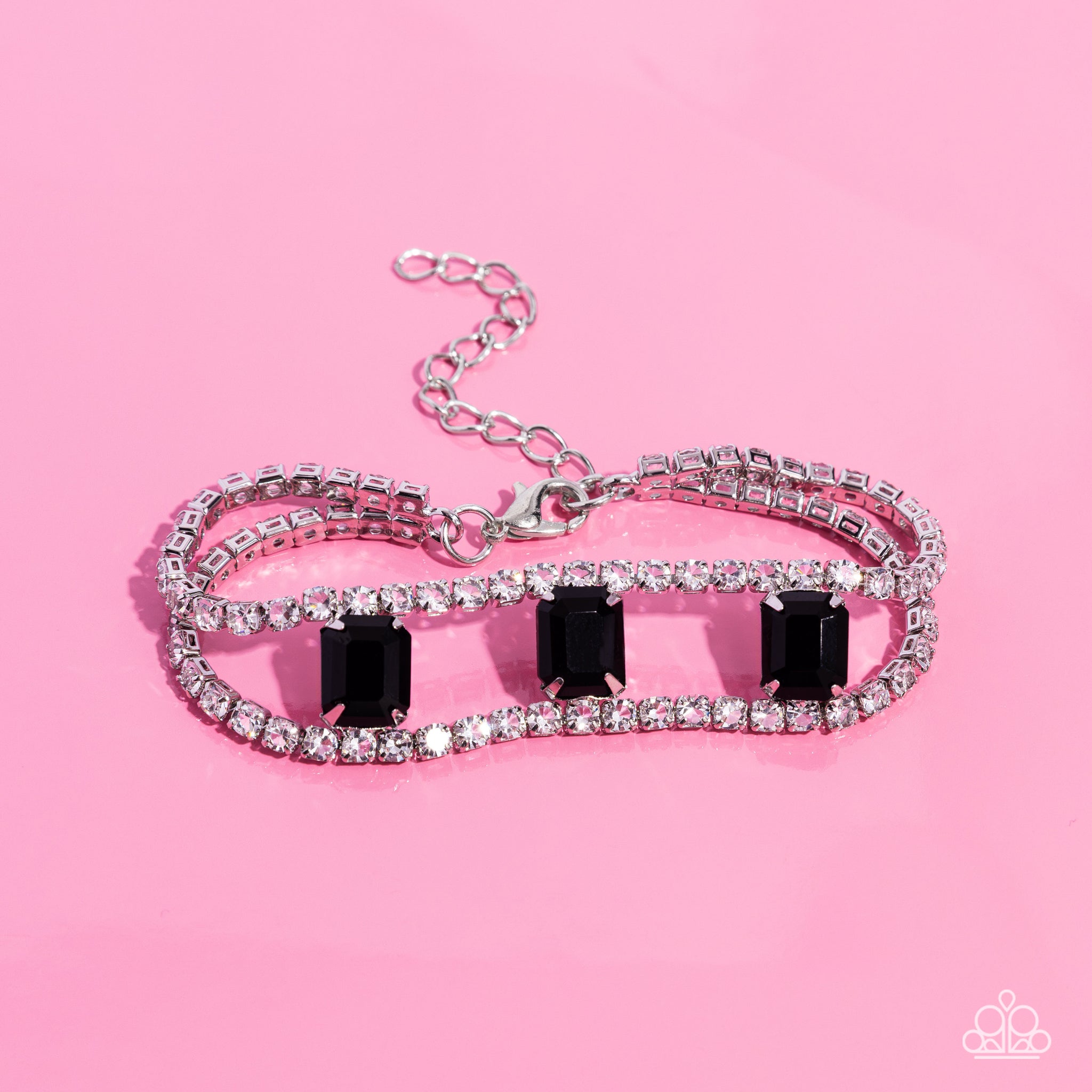 A trio of emerald-cut black gems in pronged silver fittings adorn the center of layered glassy white rhinestones in silver box chains along the wrist, creating a timeless piece around the wrist. Features an adjustable clasp closure.