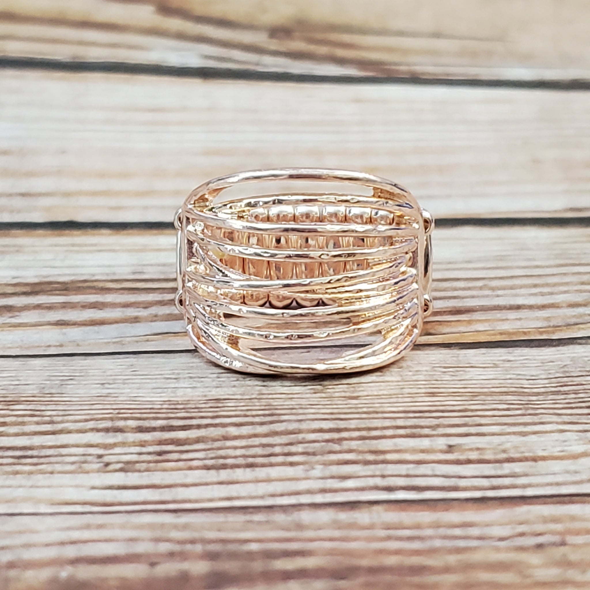 Glistening rose gold bands race across the finger, creating an airy layered band. Features a stretchy band for a flexible fit.