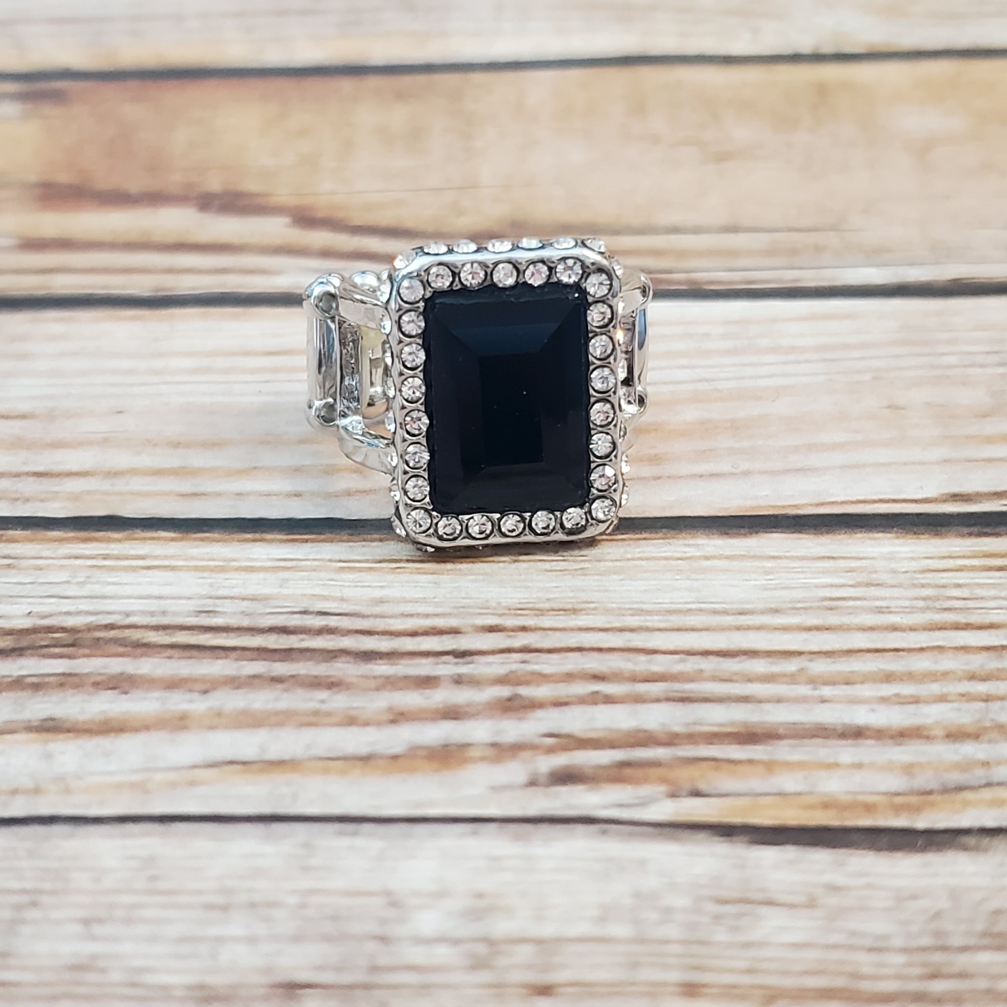 Bordered in a sparkly frame of white rhinestones, an oversized jet black emerald-cut gem adorns layered silver bands atop the finger for a jaw-dropping fashion. Features a stretchy band for a flexible fit.