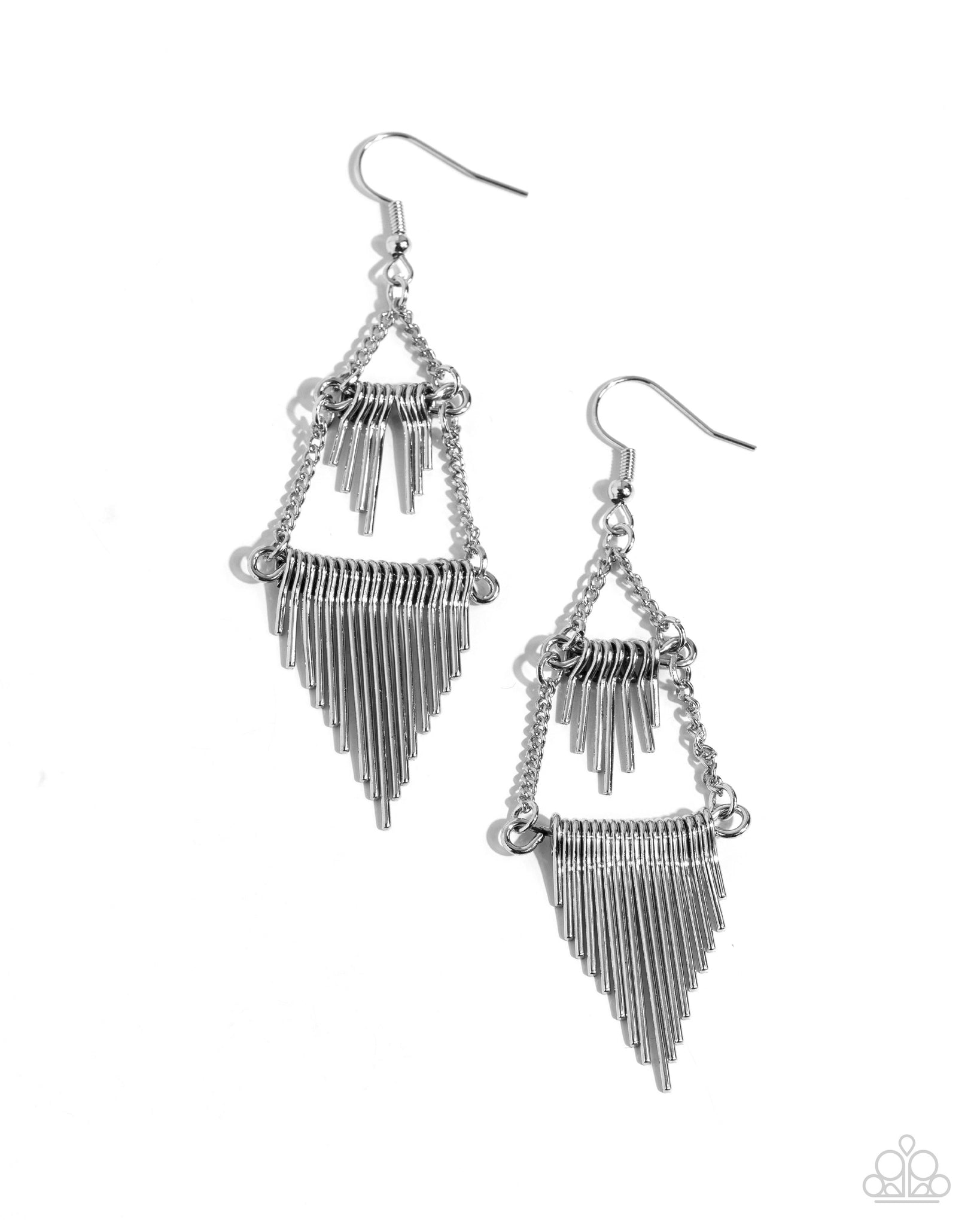 Suspended by silver chains, curtains of silver rods are threaded along sliver bars that edgily stack into a tapered fringe. Earring attaches to a standard fishhook fitting.