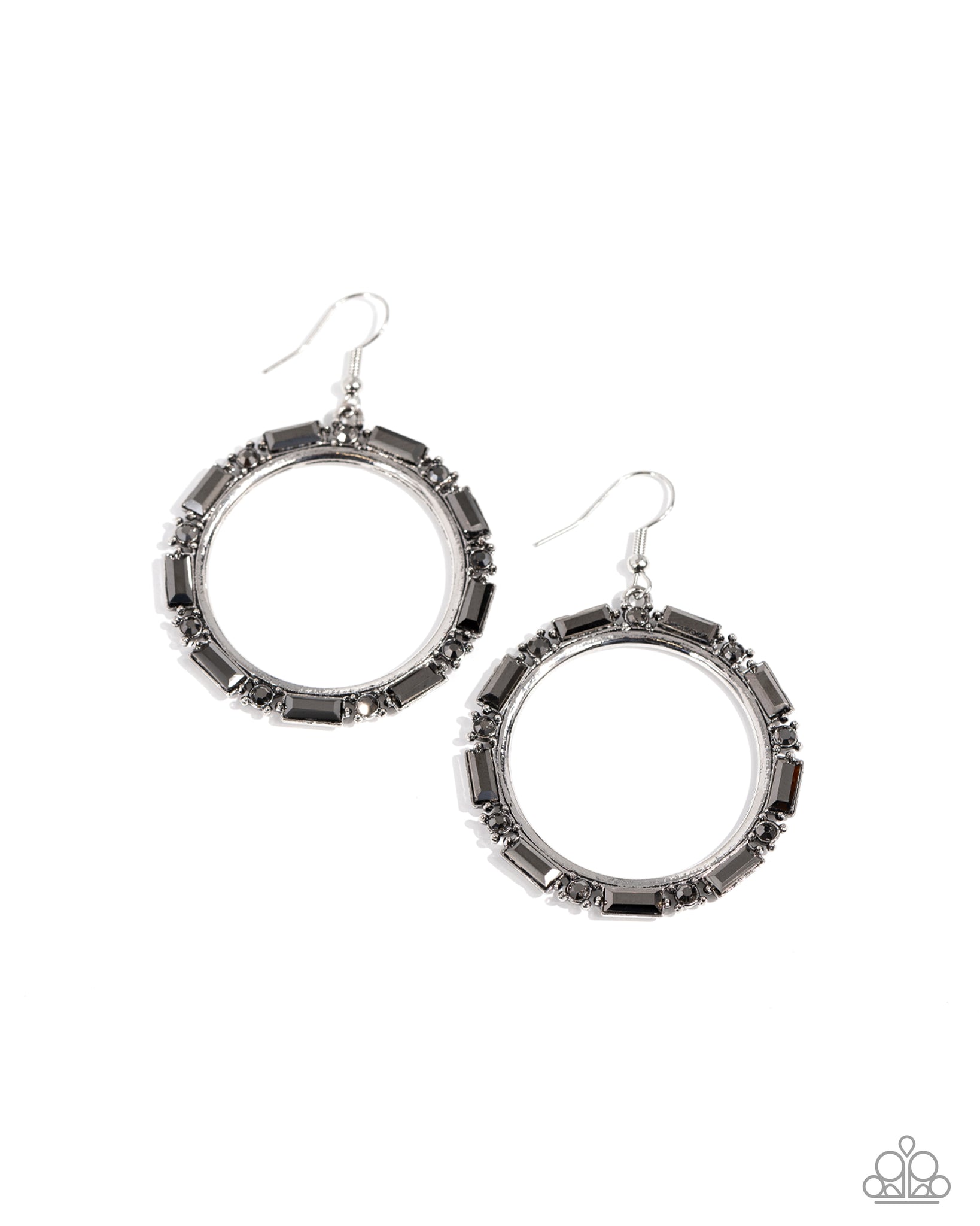 A gritty collection of round and emerald cut hematite rhinestones smolders along the outside rim of a shiny silver hoop, resulting in an edgy centerpiece. Earring attaches to a standard fishhook fitting.