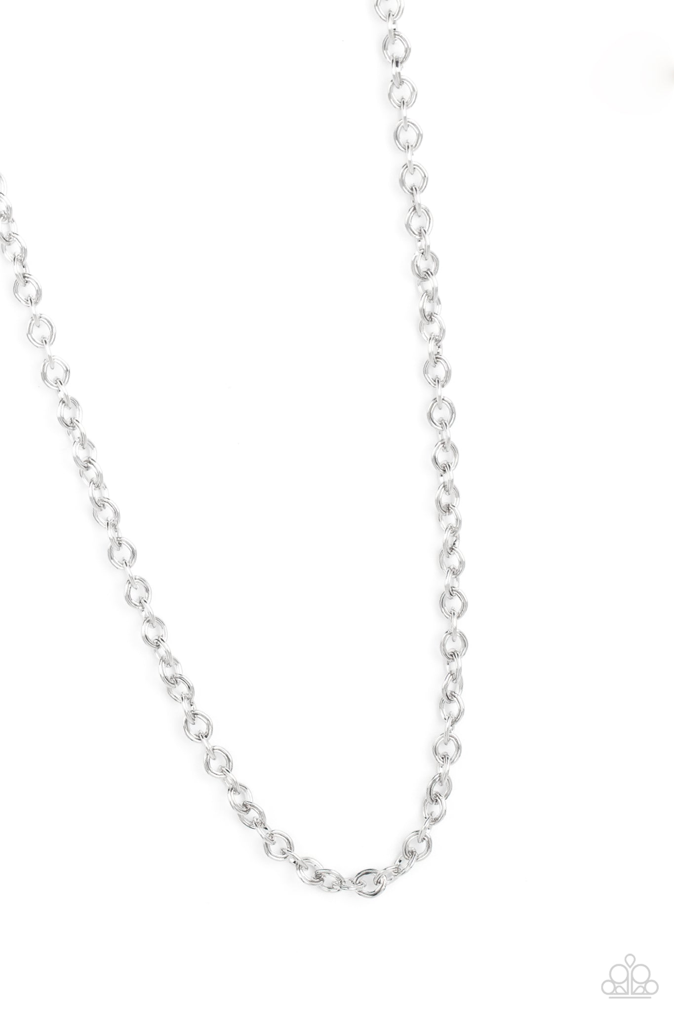 Pairs of asymmetrical silver rings join into solitaire links as they interlock across the chest, connecting into a gritty centerpiece. Features an adjustable clasp closure.