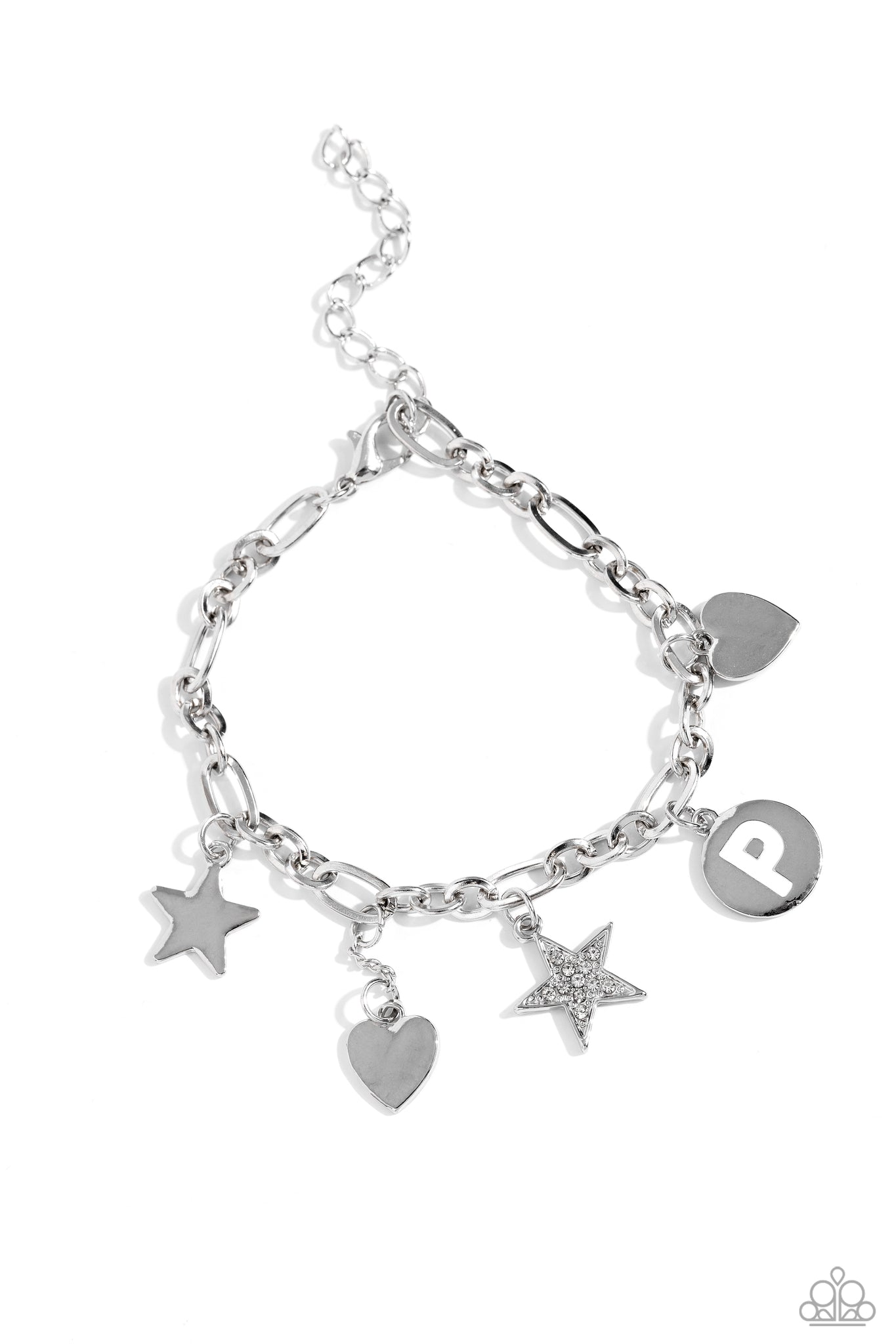 A strand of silver chain is decorated with sentimental charms, including a white rhinestone-encrusted and sleek silver star, a hammered and sleek silver heart, and a white-painted "P" silver pendant for a charismatic display around the wrist. Features an adjustable clasp closure.
