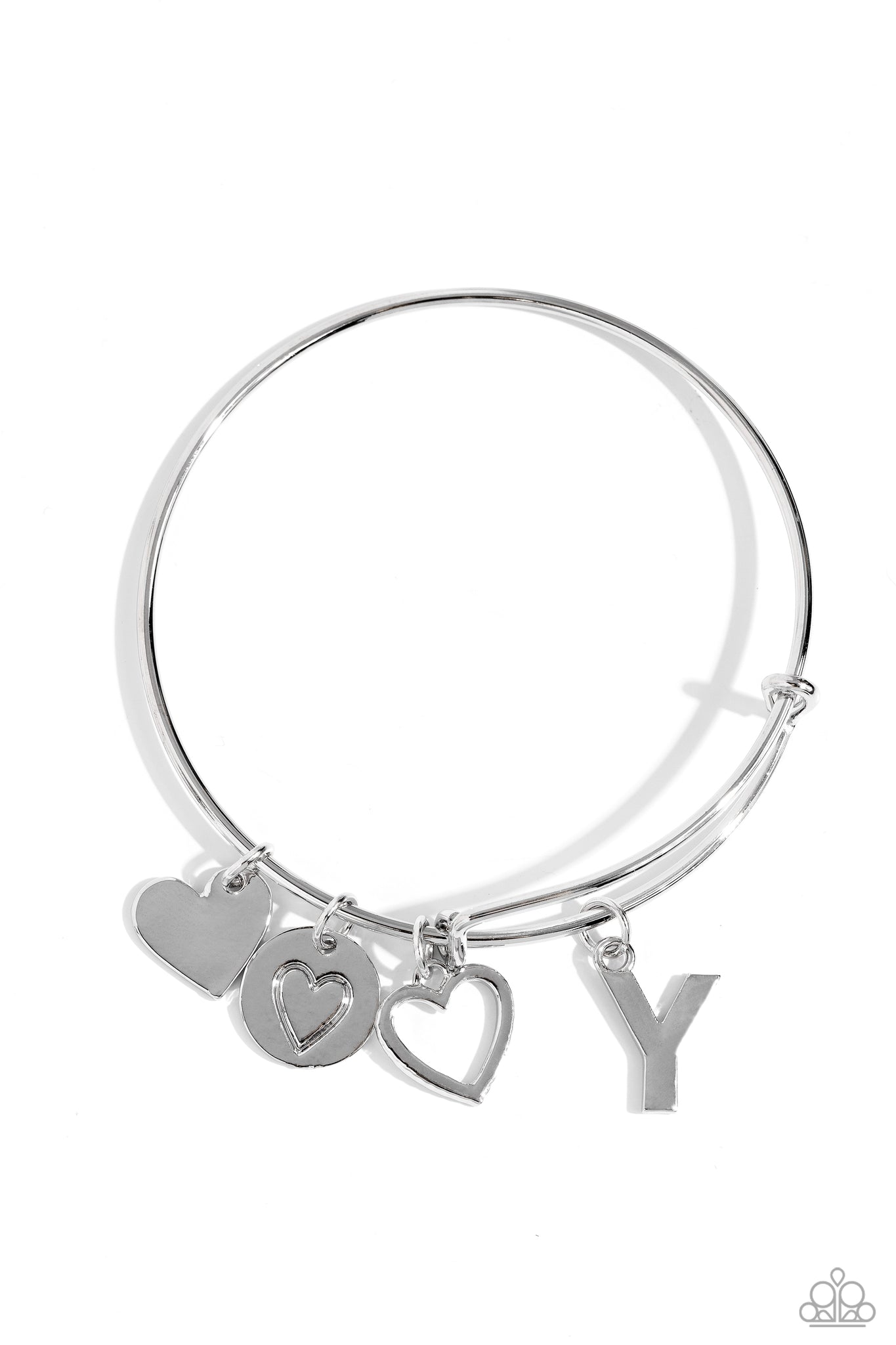 Featuring shiny silver, airy, and stamped finishes, a mismatched collection of dainty heart charms, and the letter "Y" glides along a silver bar fitting at the center of the wrist for a romantic, sentimental flair.