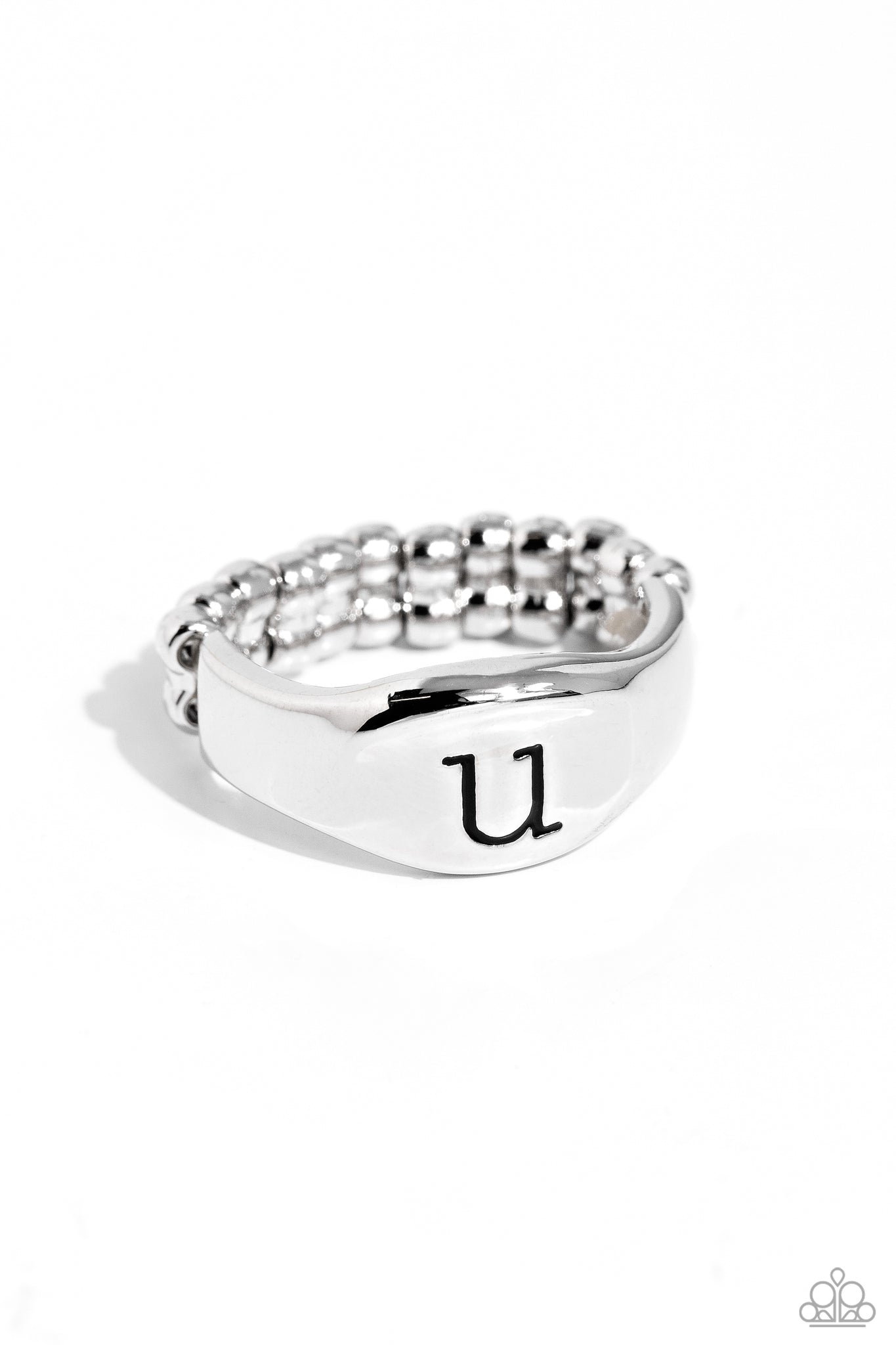 Pressed into the center of a beveled silver band, the black letter "u" stands out for a simple, sentimental centerpiece. Features a dainty stretchy band for a flexible fit.