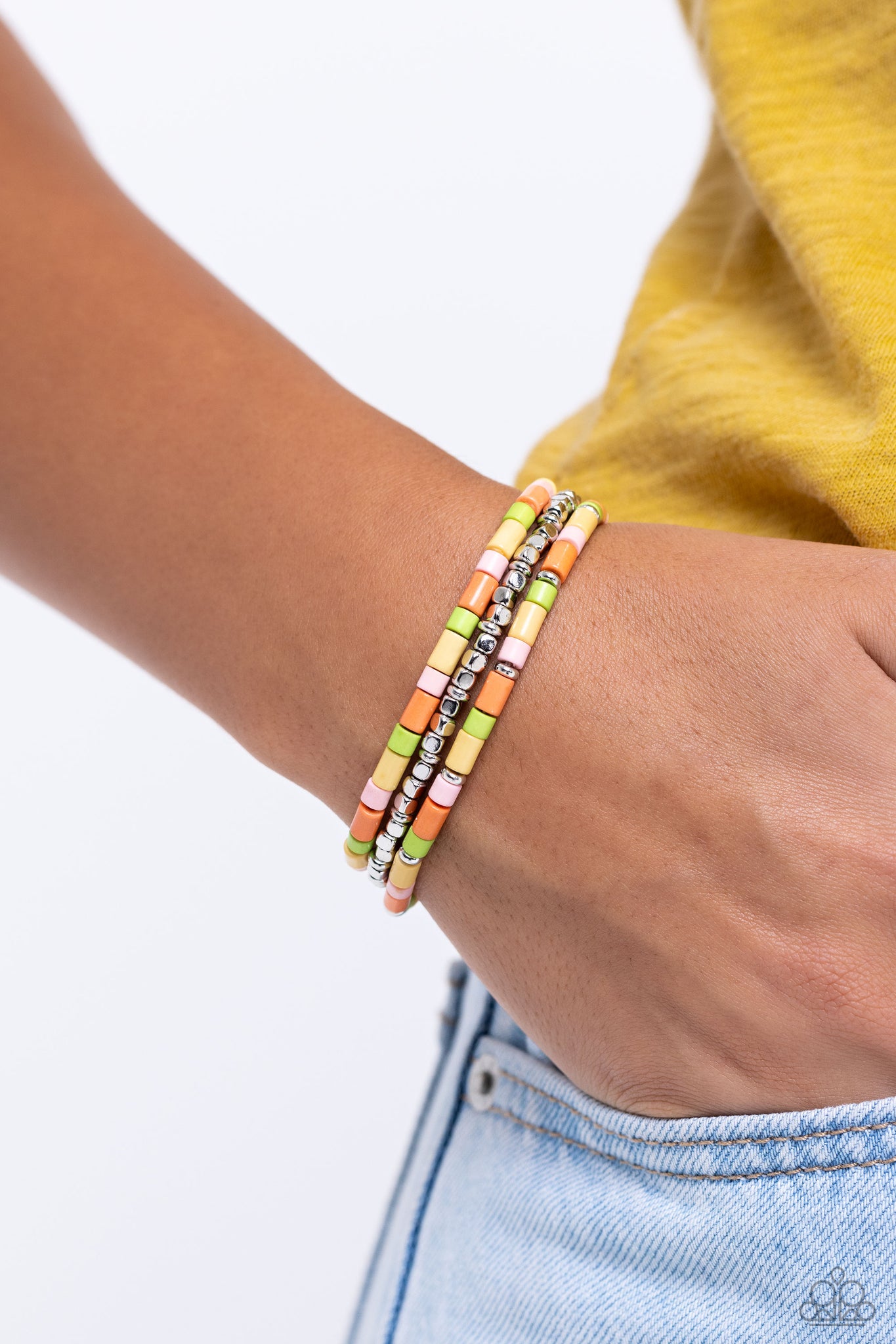 Kohlrabi, Crystal Rose, orange, and yellow cylindrical stone beads, sporadically dotted with silver accents, combine with a strand of glistening silver cube beads along stretchy bands, creating all-natural layers around the wrist.