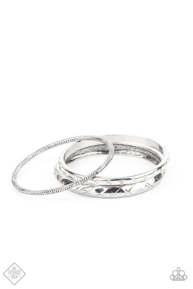 A thick silver bangle that is embossed and faceted in an edgy geometric pattern joins a mismatched pair of white rhinestone encrusted and diamond cut silver bangles that glide along the wrist, displaying a gritty pop of shimmer.