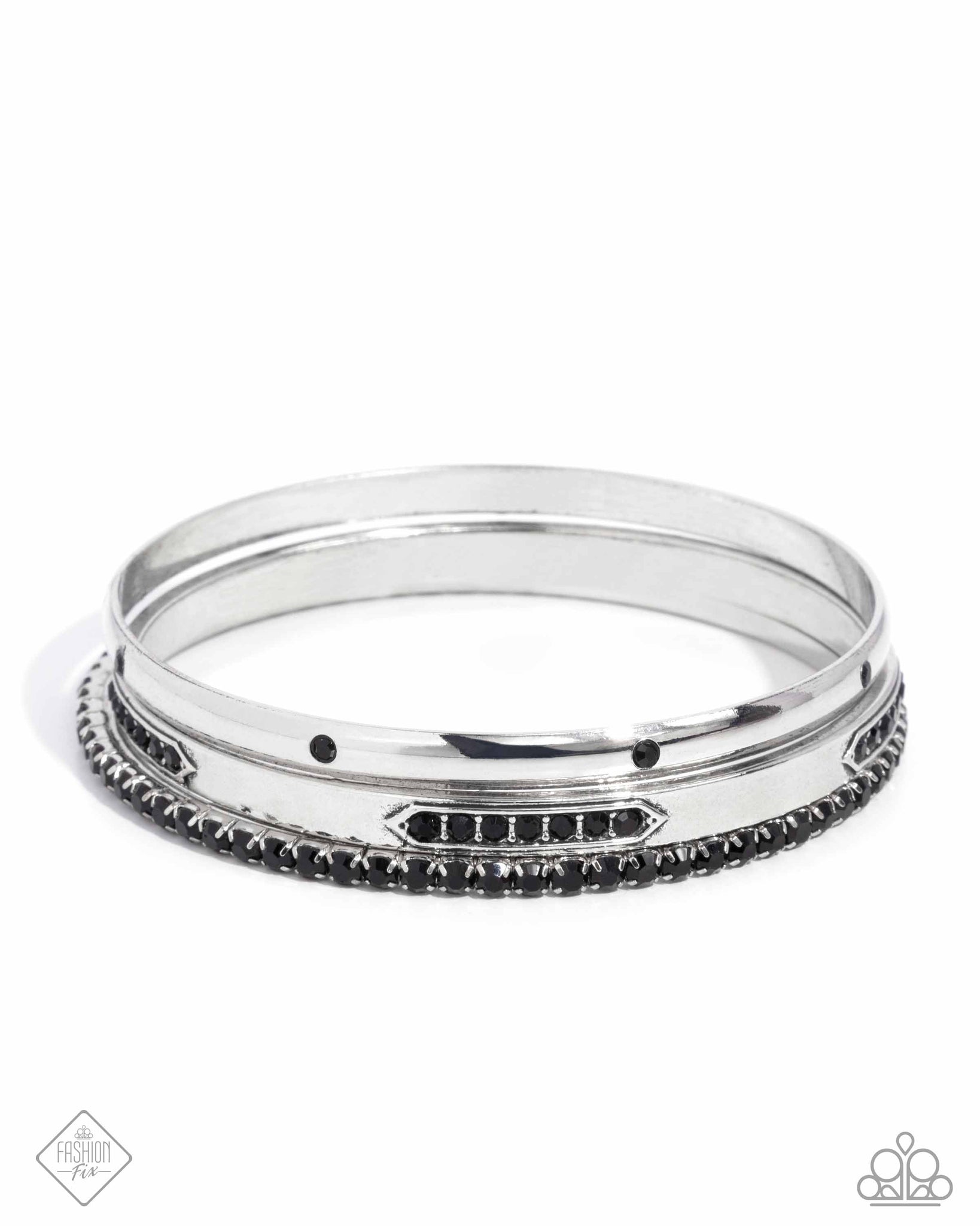 A collection of thick, smooth bangles, sporadically patterned with black rhinestones joins a pronged row of black rhinestones bangle, creating a sassy chiming melody and leaving a dramatic impact as the bright, shimmering silver surfaces stack up the wrist.