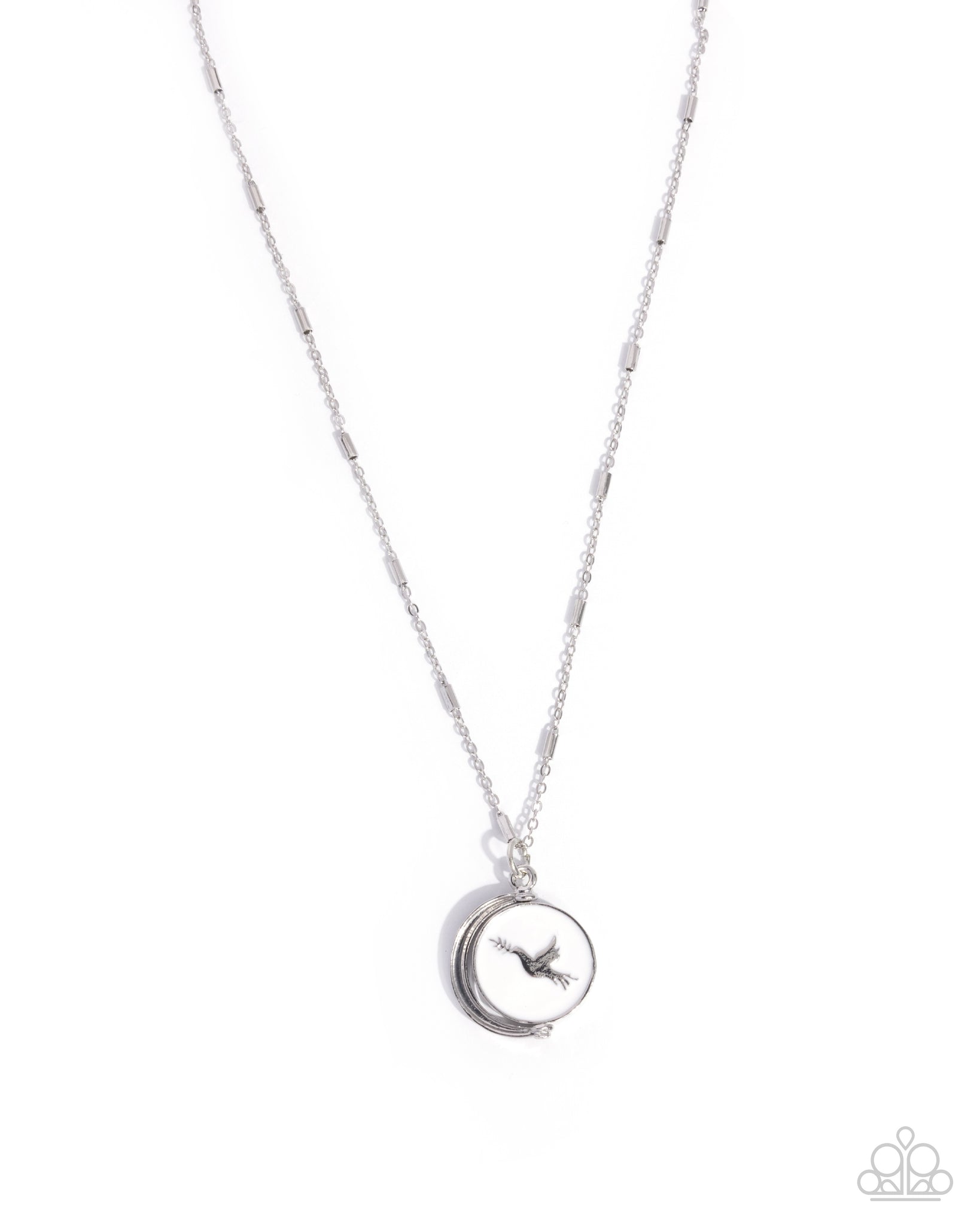 A dainty silver chain adorned with cylindrical metal bars give way to a circular pendant, featuring a white background and a silver embossed bird on one side, and the word "hope" on the other side. The minimalist design offers a chic and graceful look as the pendant can twist to either design. Features an adjustable clasp closure.
