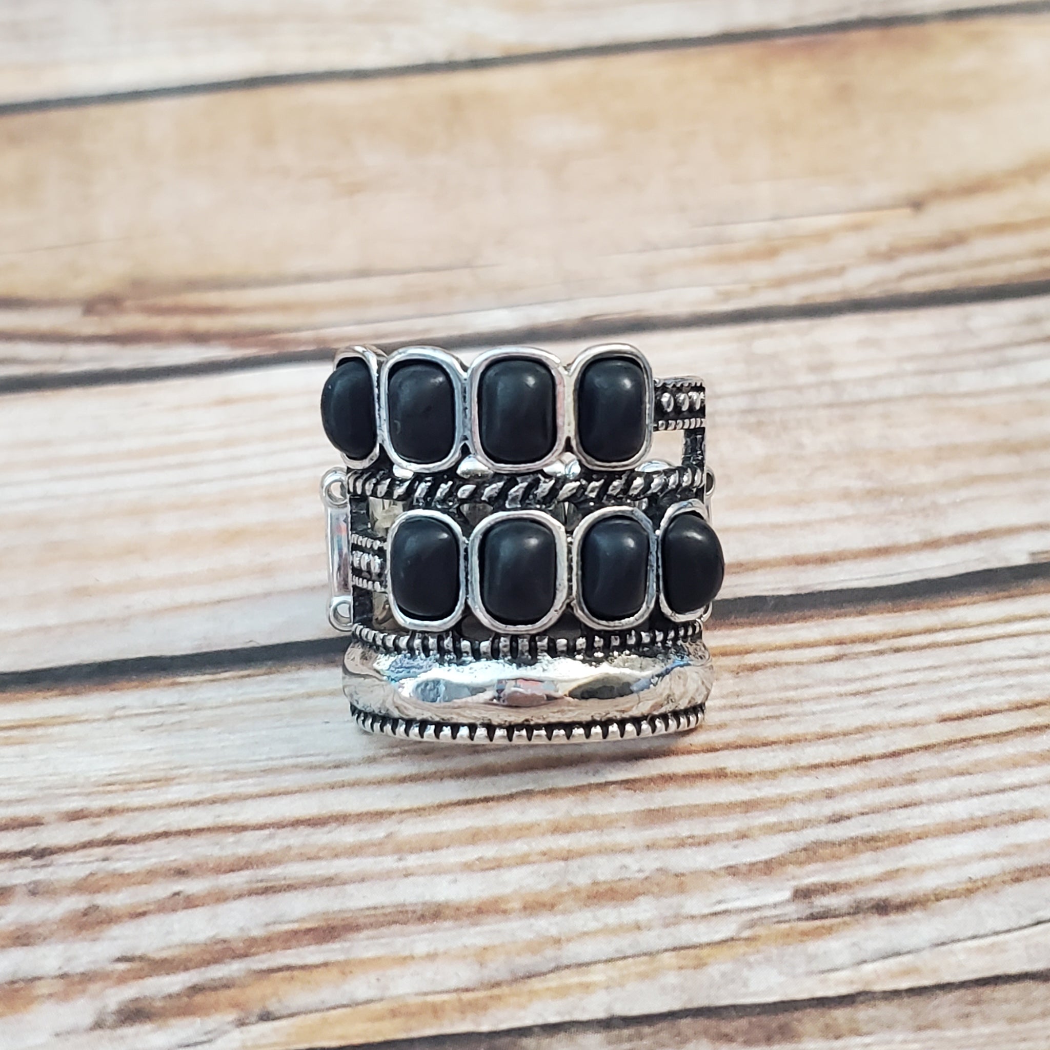 Mismatched rows of black rectangular stone beads, twisted silver and studded silver bars, and a faceted silver band haphazardly layer across the finger, coalescing into a colorfully rustic centerpiece. Features a stretchy band for a flexible fit.