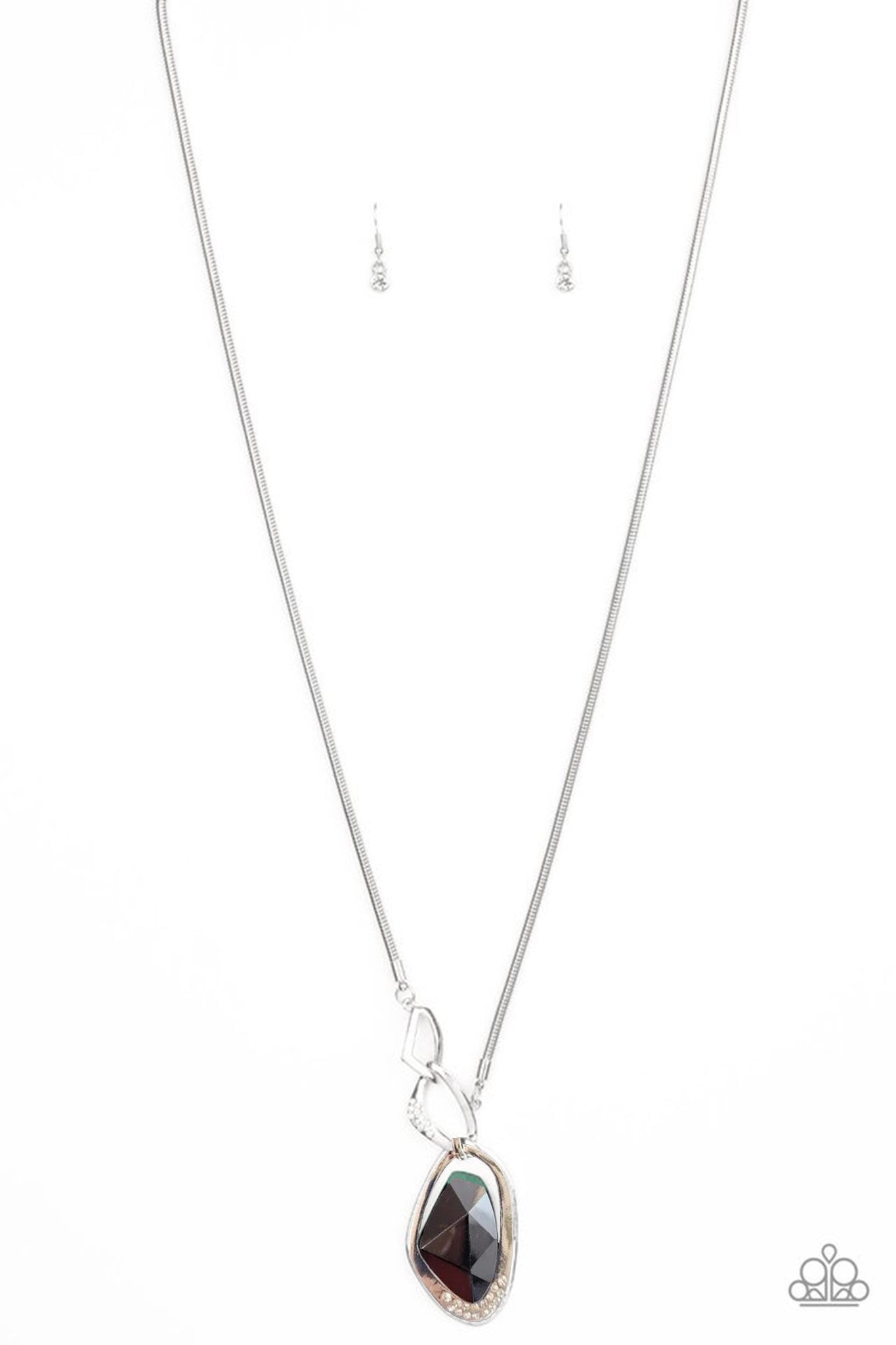 A faceted black gem is nestled inside of a shimmery silver frame encrusted in dainty white rhinestones. The glittery pendant asymmetrically links with abstract silver frames at the bottom of a lengthened silver rounded snake chain for a modern look. Features an adjustable clasp closure.