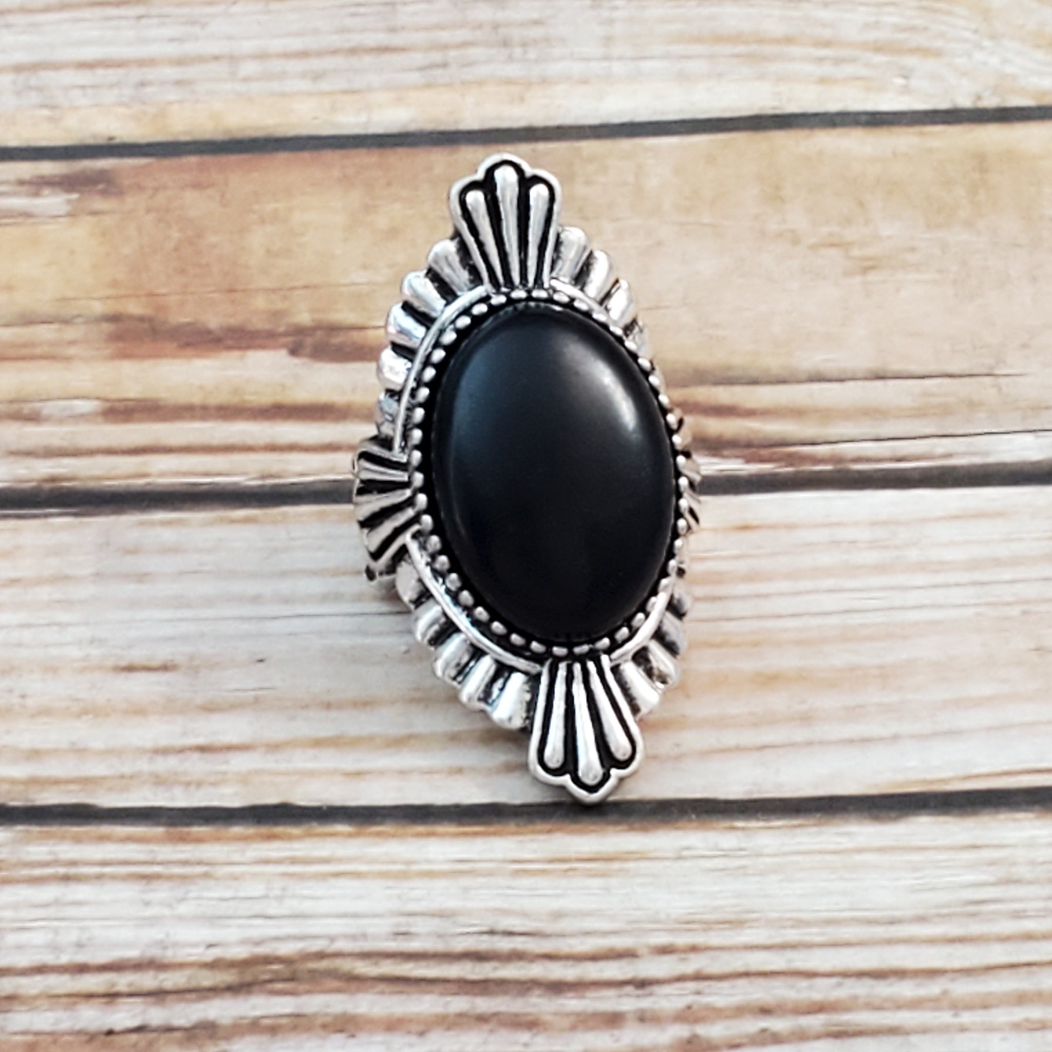 Featuring antiqued linear textures, a scalloped silver frame flares out from a dramatically oversized black stone center for a seasonal look. Features a stretchy band for a flexible fit.
