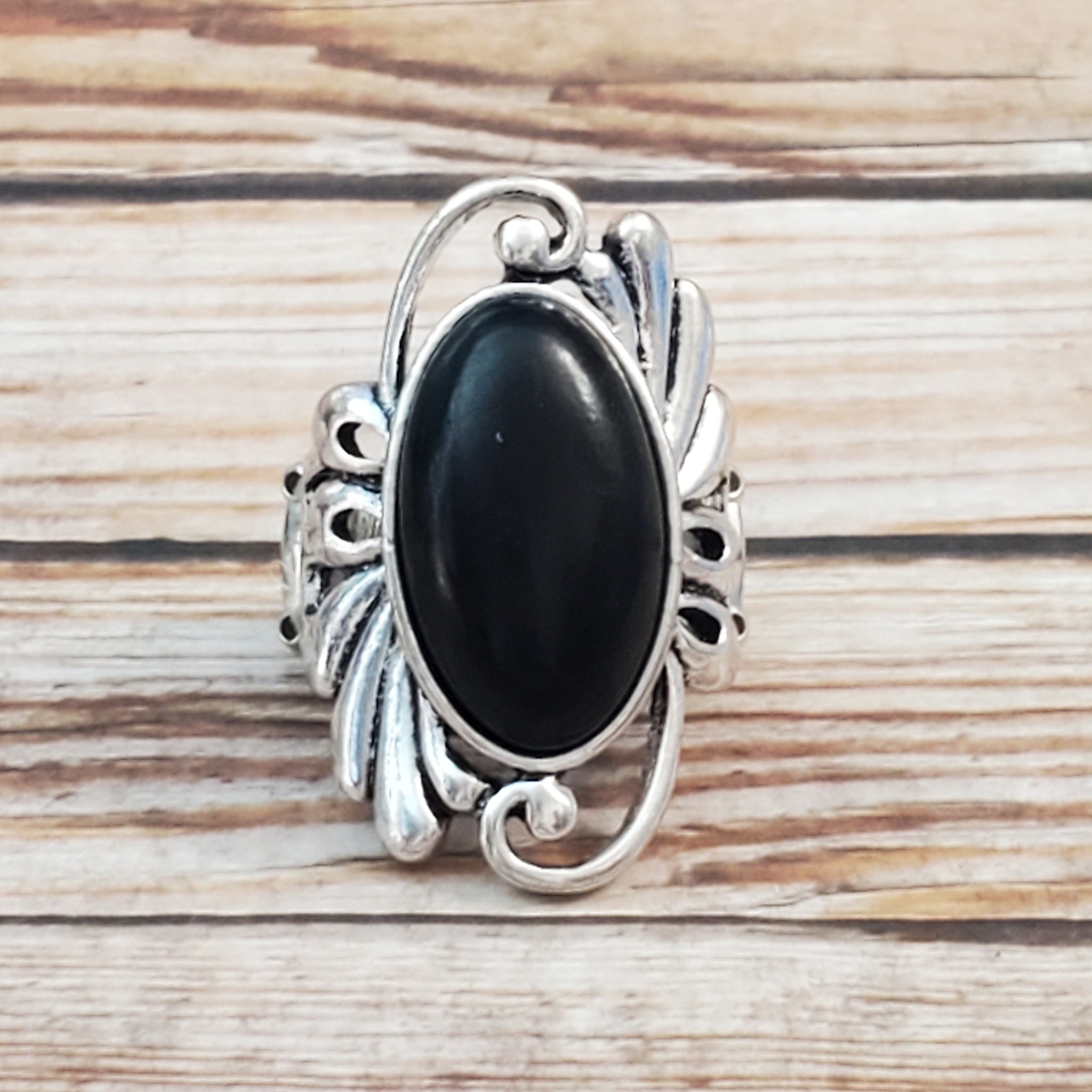 Chiseled into a smooth oval, an earthy black stone is pressed into the center of a glistening silver frame radiating with filigree detail for a seasonal look. Features a stretchy band for a flexible fit.