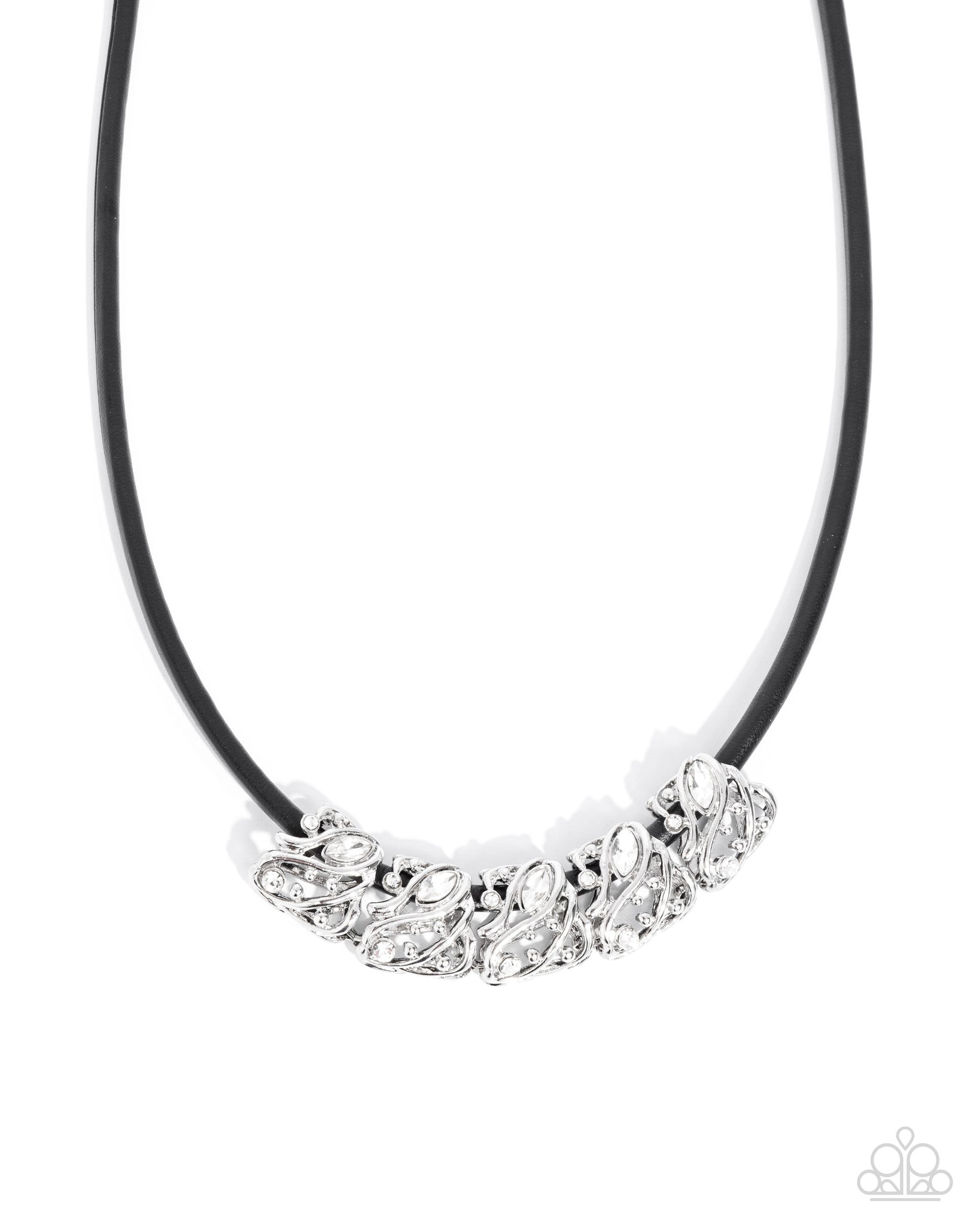 Sporadically dotted with round white rhinestones, silver studs, and marquise-cut white gems, whimsical filigree sprig-inspired silver fittings are infused along a rounded black cord for a radiantly radical display. Features an adjustable clasp closure.