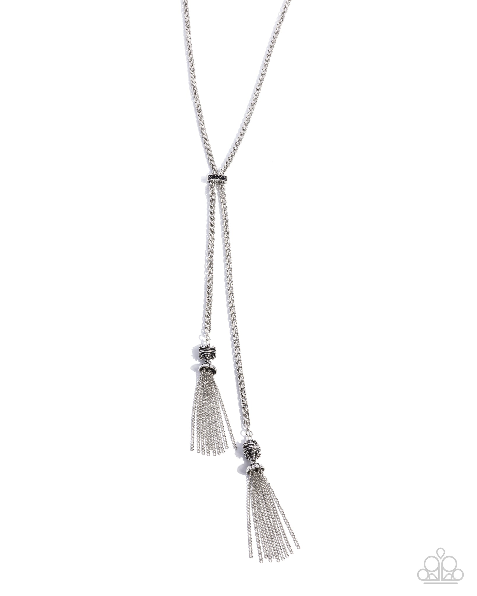 Featuring a dainty dusting of black rhinestones, a curved silver pendant rests along bold silver chained strands leading the eye to silver-studded and rope-textured silver ornaments and glistening silver chained tassels, creating an adjustable pendant full of attitude. Features an adjustable clasp closure.