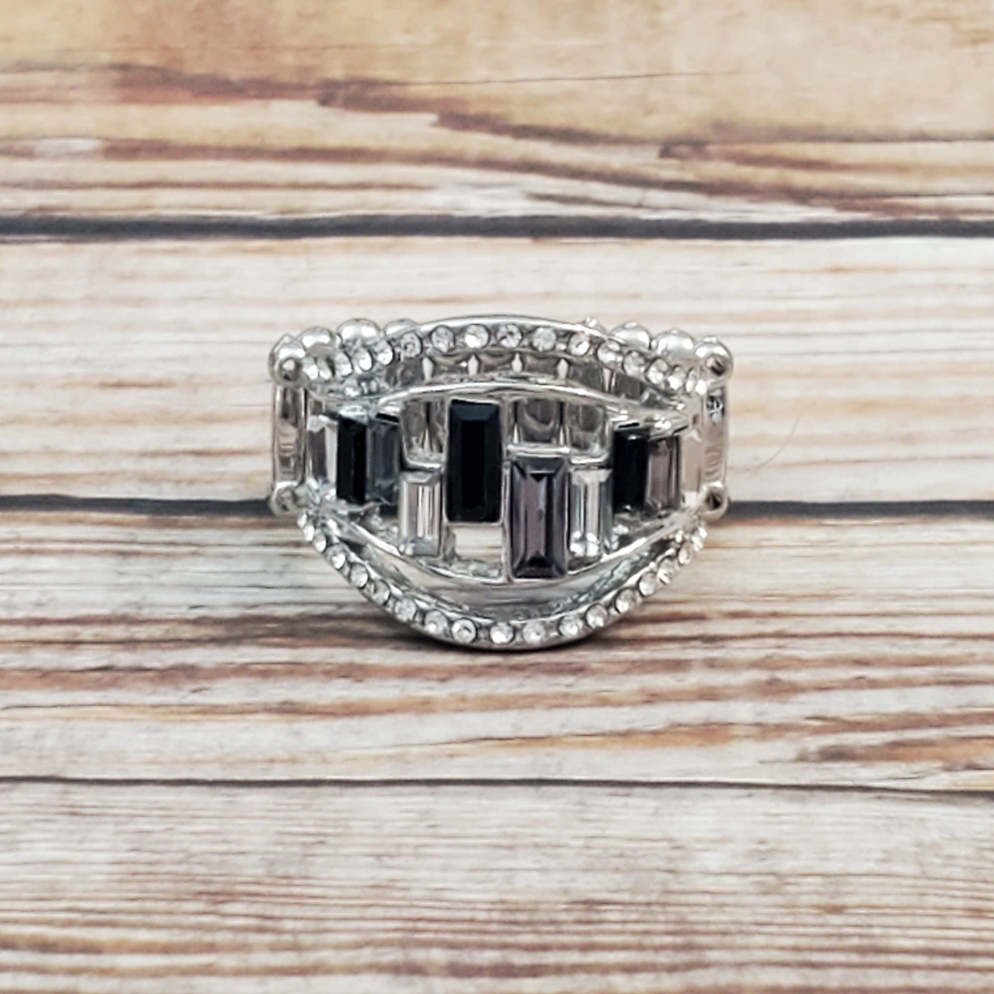 White rhinestone encrusted bands flank a row of emerald cut glass beads in shades of black, gray, and white for a regal look. Features a stretchy band for a flexible fit.