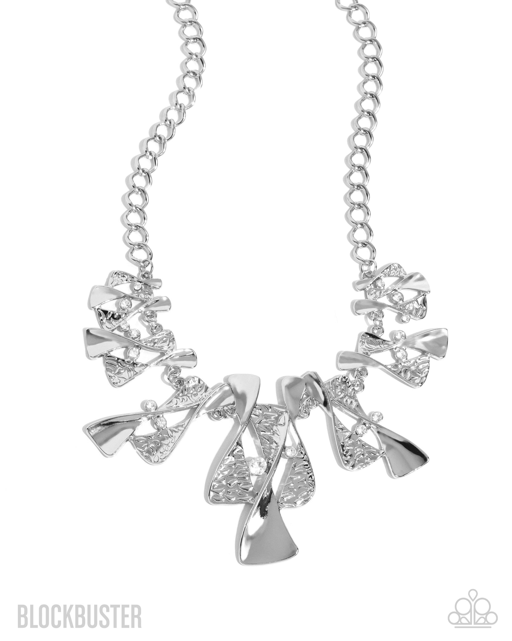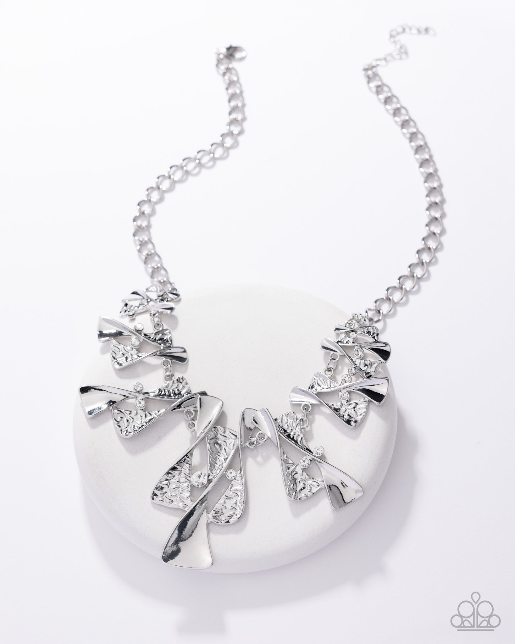 Twisted silver hourglasses dance along a chunky silver chain with tiny clear rhinestones adding sparkling, elegant accents. Beautiful textured pieces add depth to the design. Features an adjustable clasp closure.