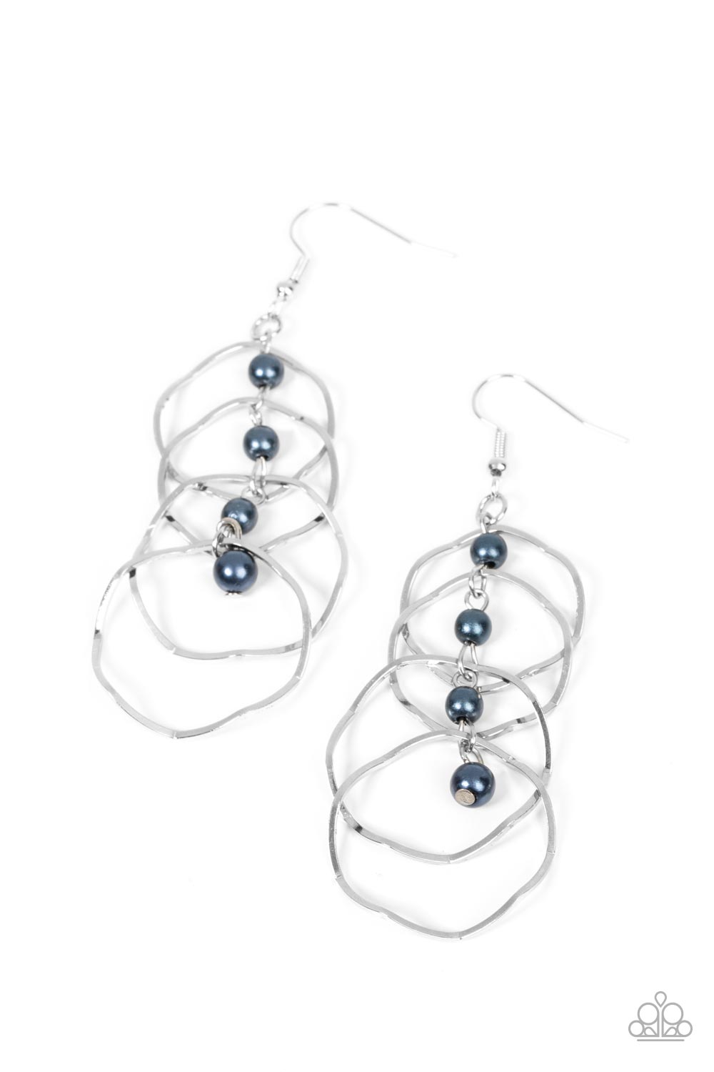 Zigzagging silver hoops trickle from a dainty strand of blue pearls, overlapping into a bubbly lure. Earring attaches to a standard fishhook fitting.