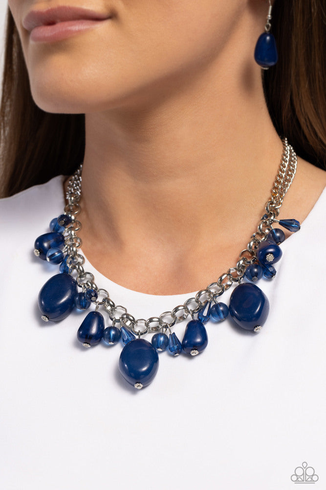 Glassy blue beads and teardrop accents join an oversized assortment of Rhodonite faux stone beads dancing below the collar, resulting in a flirtatious fringe. Features an adjustable clasp closure.