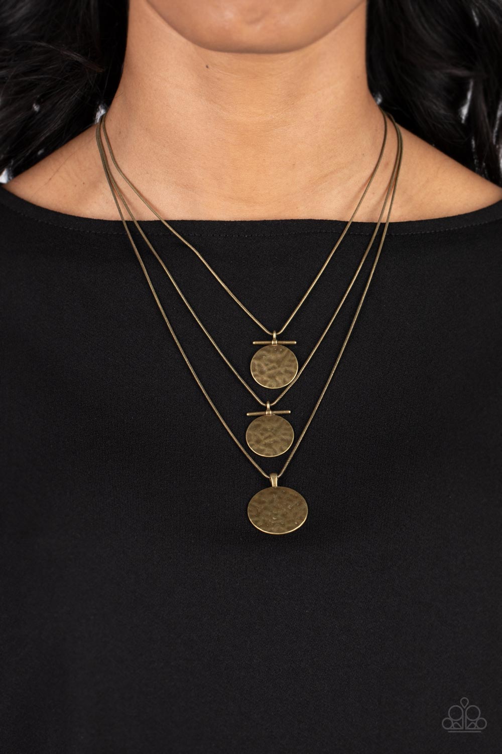 Three strands of skinny brass snake chain fall into tiered layers as they cascade down the chest. Gritty brass discs hammered in rippling texture slide along each chain in a dizzying display, with thin bars of brass crowning the top two pendants.