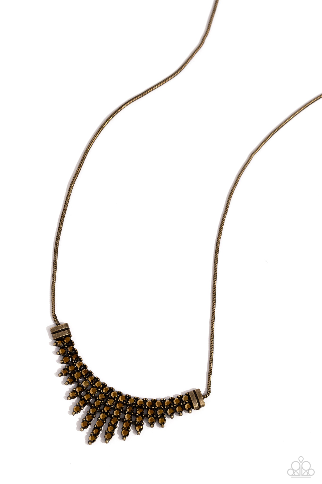 Featuring dainty studded brass fittings, glitzy rows of sparkly aurum rhinestones stack into a gritty diadem that bows below the collar. Spanning from a brass snake chain, duos of gritty brass beads border the royally edgy design for additional eye-catching sheen. Features an adjustable clasp closure.
