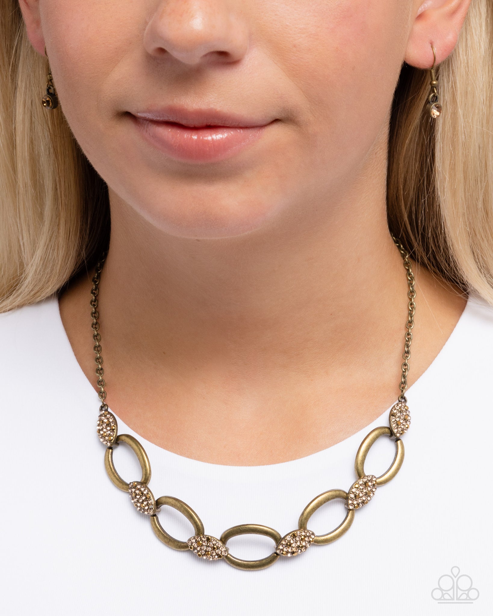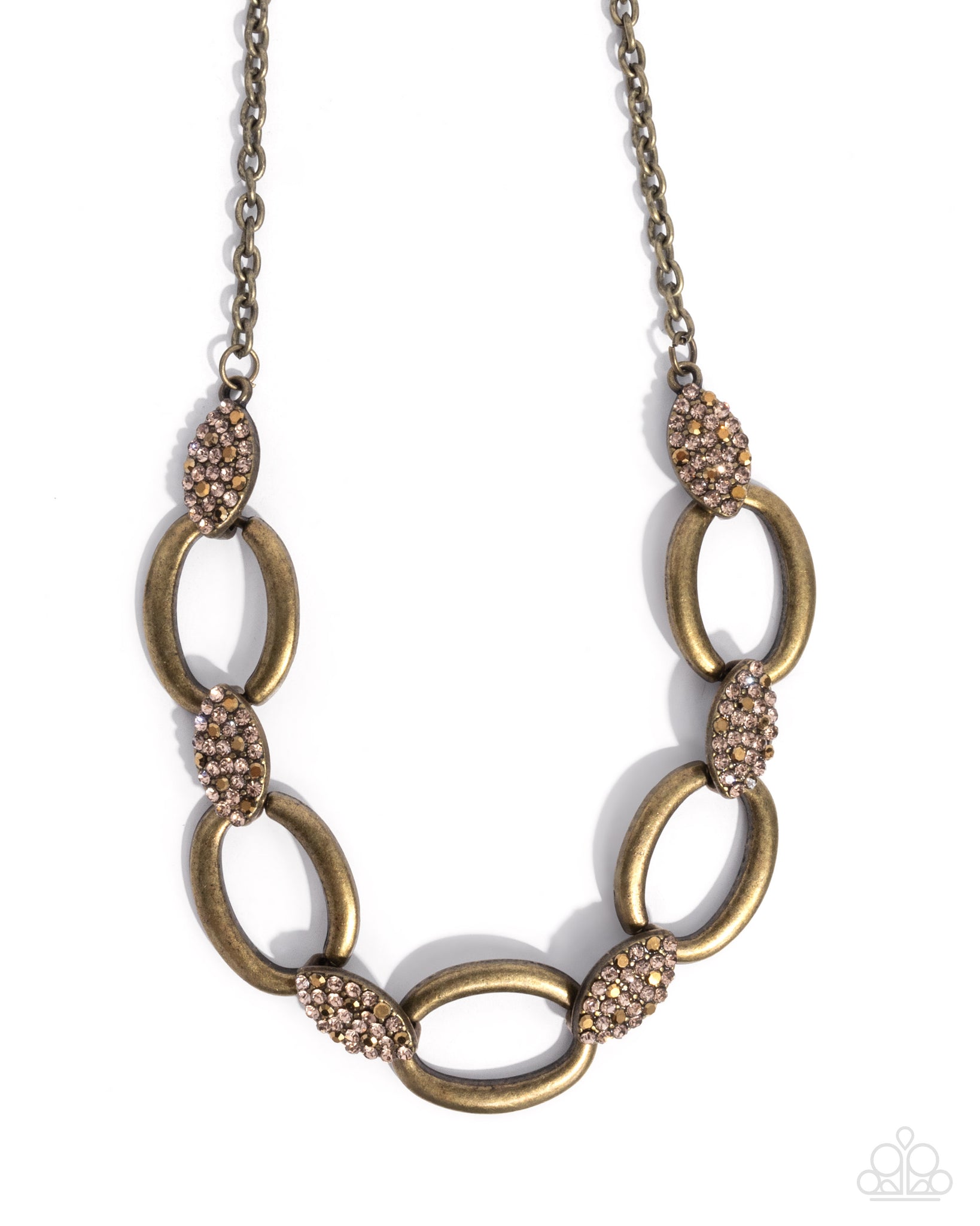 Connecting to a brass cable chain, a collection of antiqued brass oval links alternate with aurum and light-colored topaz rhinestone-dusted prolate spheroids below the neckline for a rustic radiant display. Features an adjustable clasp closure.