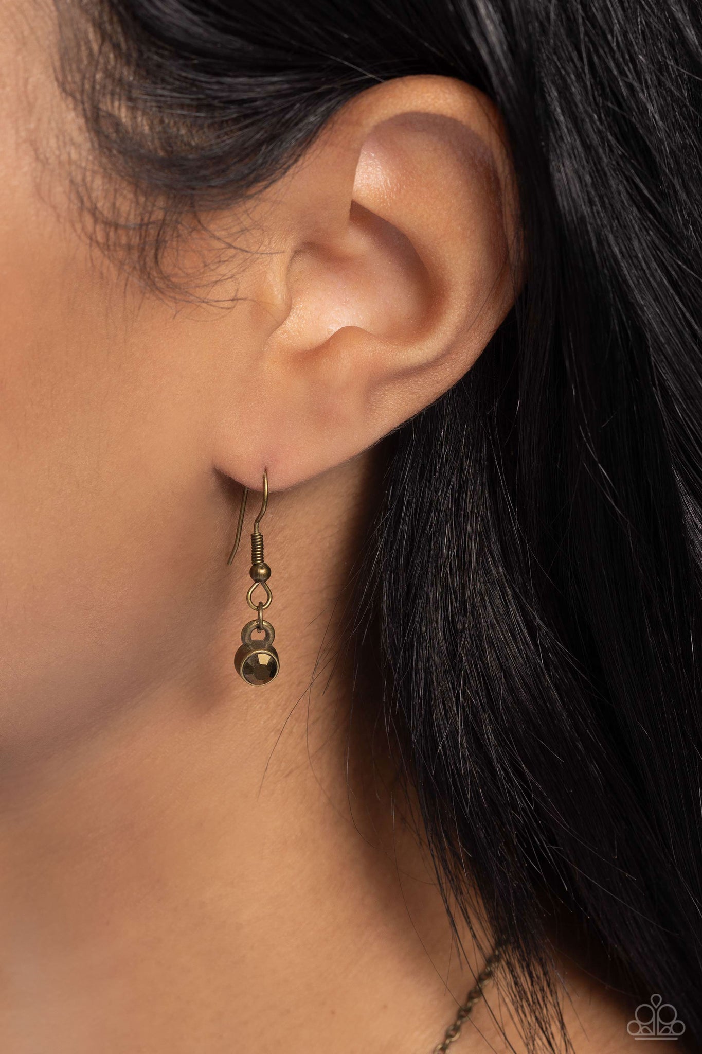 Encrusted in glitzy aurum rhinestones, a hammered brass half moon pendant is horizontally suspended at the bottom of a dainty brass chain for an edgy glamour. Features an adjustable clasp closure.
