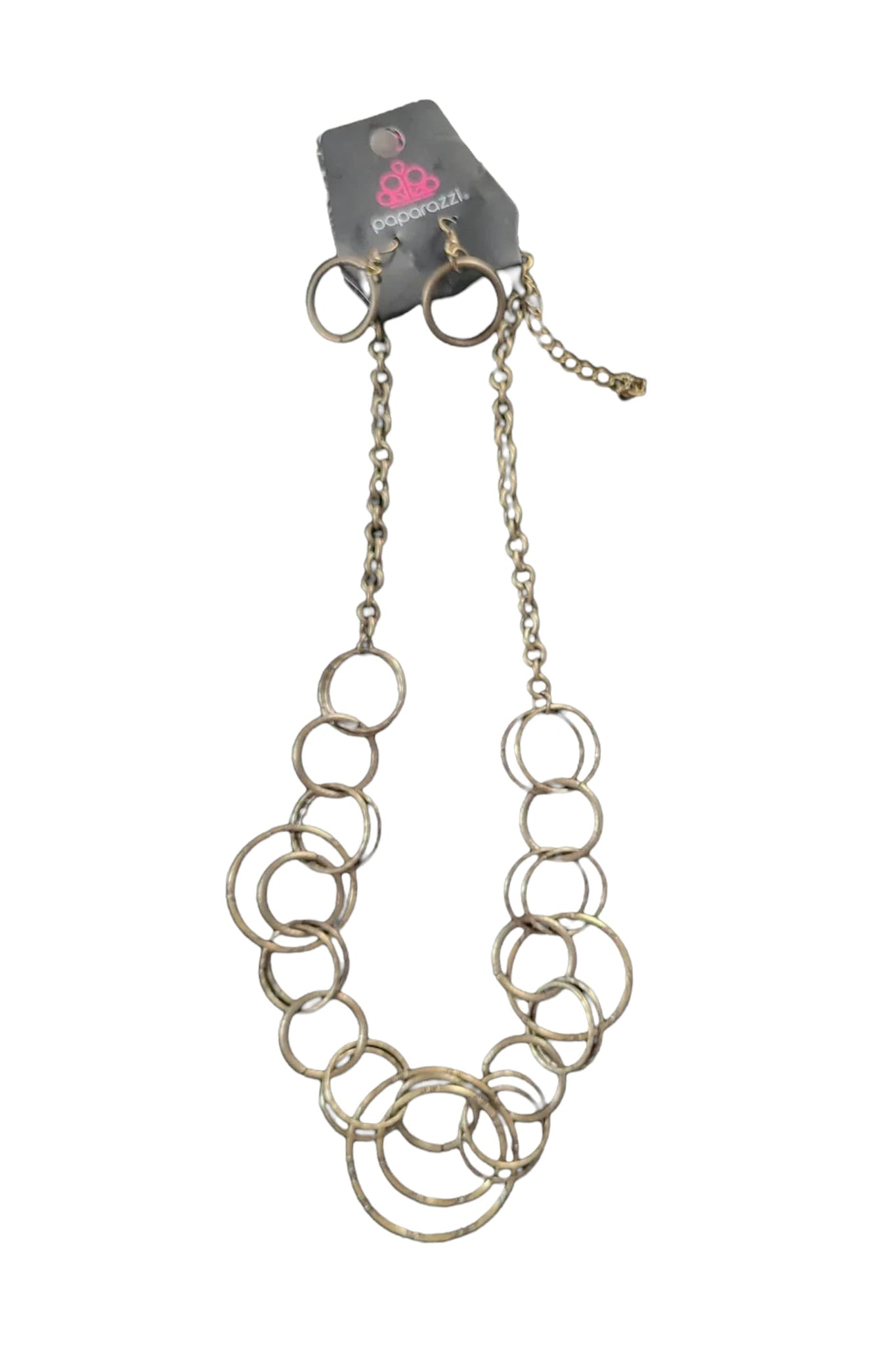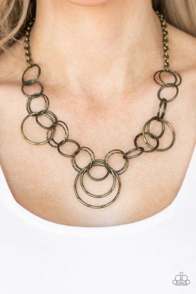 Varying in size and texture, a collision of antiqued brass rings link below the collar for a dizzying look. Features an adjustable clasp closure.