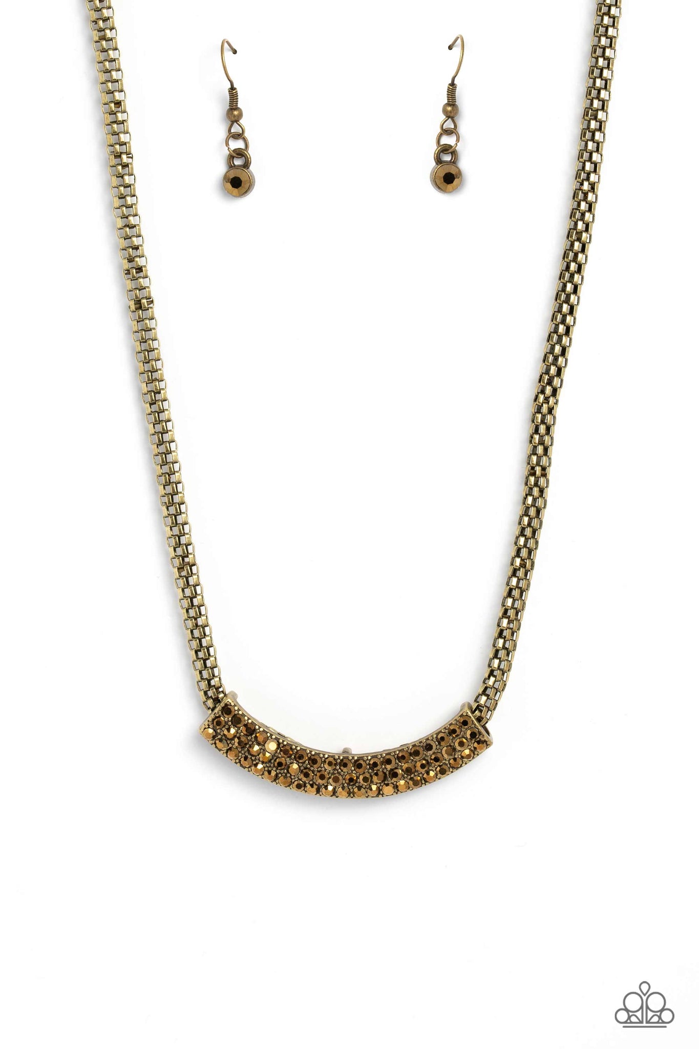 Featuring a gritty finish, a curved brass pendant slides along a rounded brass mesh chain below the collar. Three rows of dainty aurum rhinestones encrusted along the brass frame, add hints of shimmer to the bold industrial palette. Features an adjustable clasp closure.