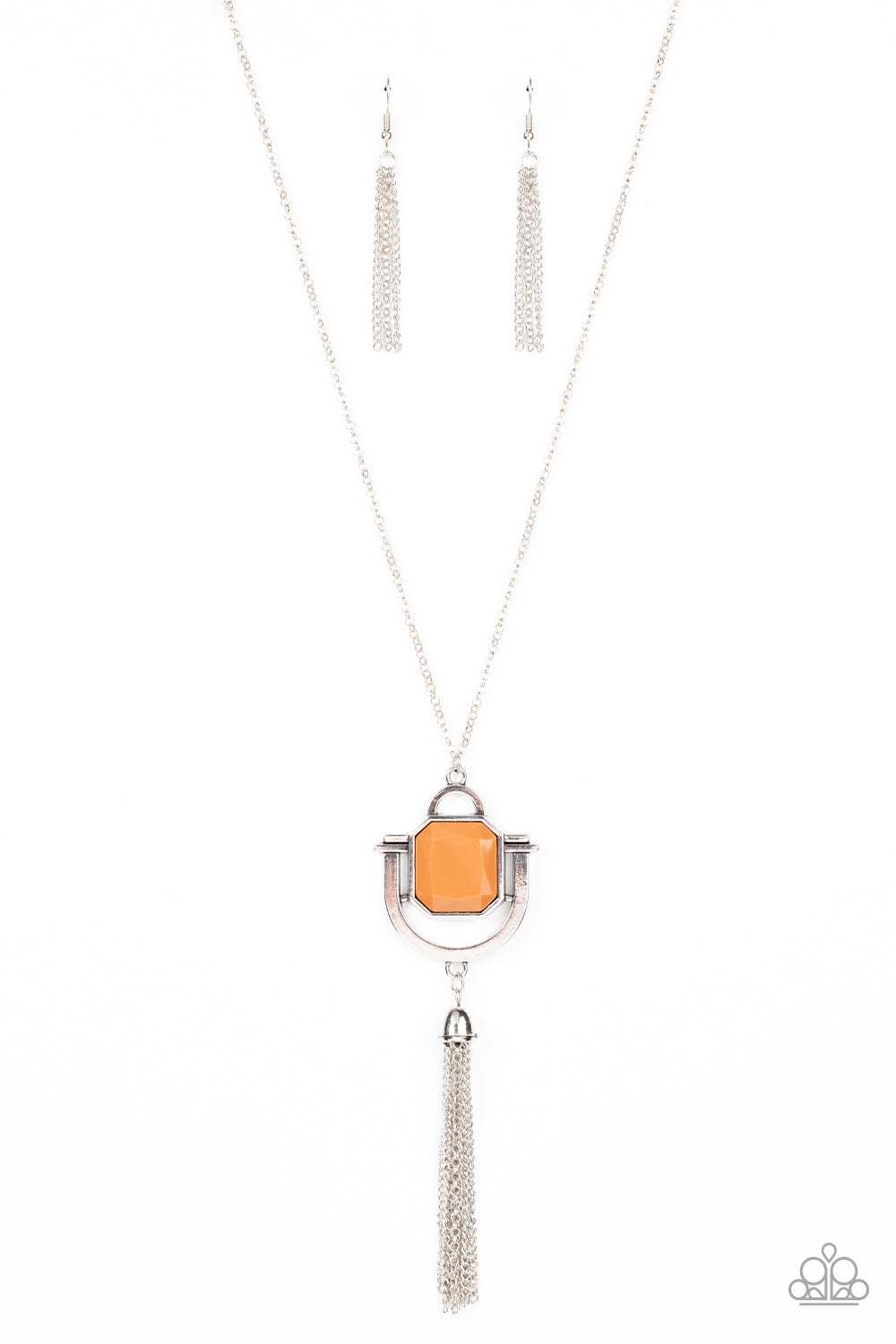 A faceted geometric Adobe bead is pressed into a stacked southwestern inspired silver frame at the bottom of an extended silver chain. A shimmery silver chain tassel swings from the bottom of the display, adding whimsical movement. Features an adjustable clasp closure.