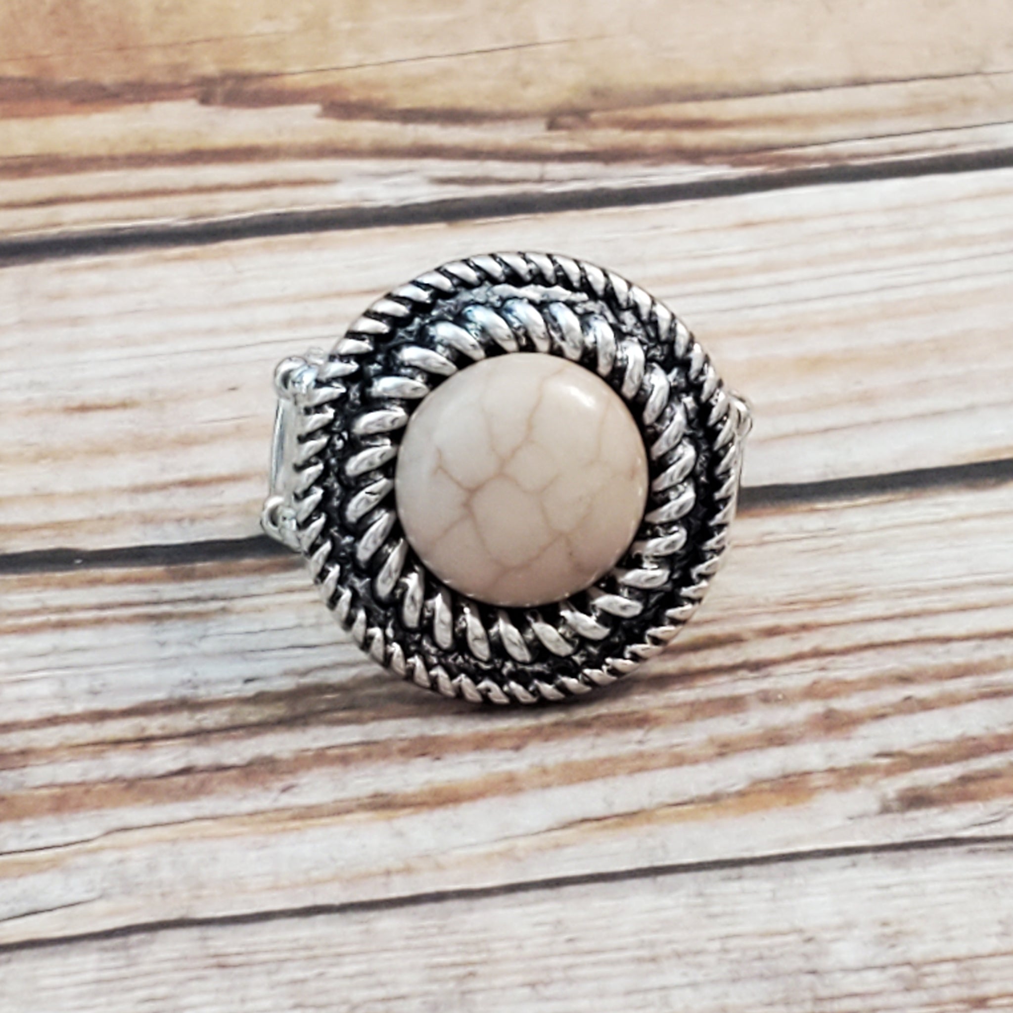 A smooth brown stone is pressed into an antiqued silver frame radiating with twisted rope-like textures for an artisan inspired look. Features a stretchy band for a flexible fit.