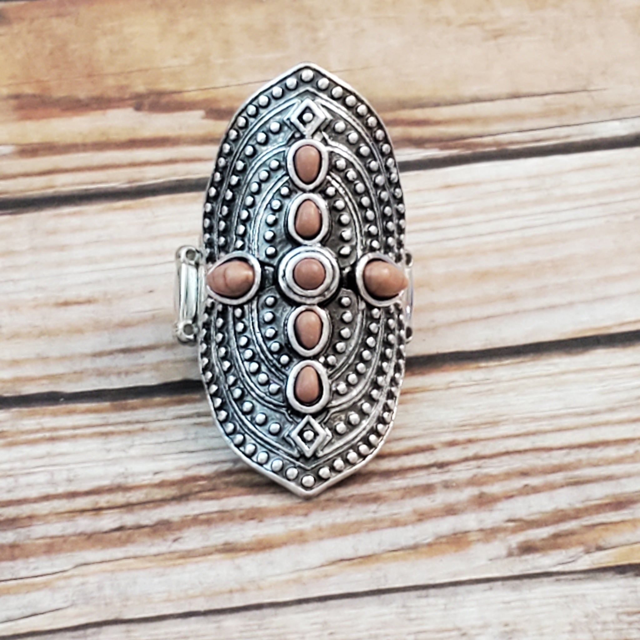A dainty collection of imperfect brown stones adorn the center of an oversized frame radiating with antiqued studs for a bold tribal inspired look. Features a stretchy band for a flexible fit.