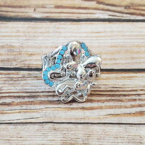 Enhanced with blue opal rhinestones, a shiny collection of mismatched silver butterfly frames flutters atop the finger, resulting in a whimsical bouquet. Features a stretchy band for a flexible fit.