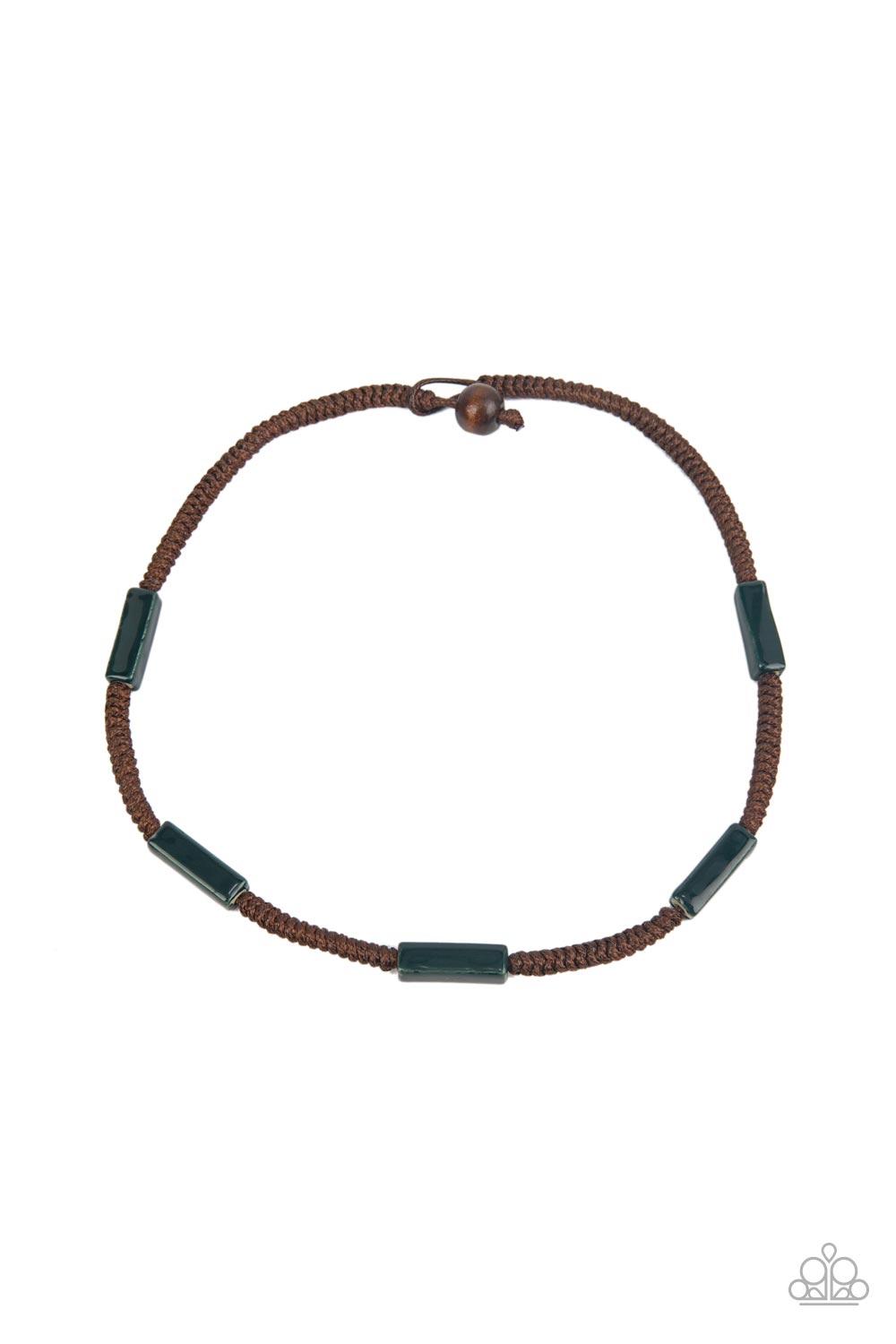 Glazed in a shiny green finish, rectangular ceramic beads are knotted in place along braided brown cording below the collar for a colorfully urban look. Features a button loop closure.