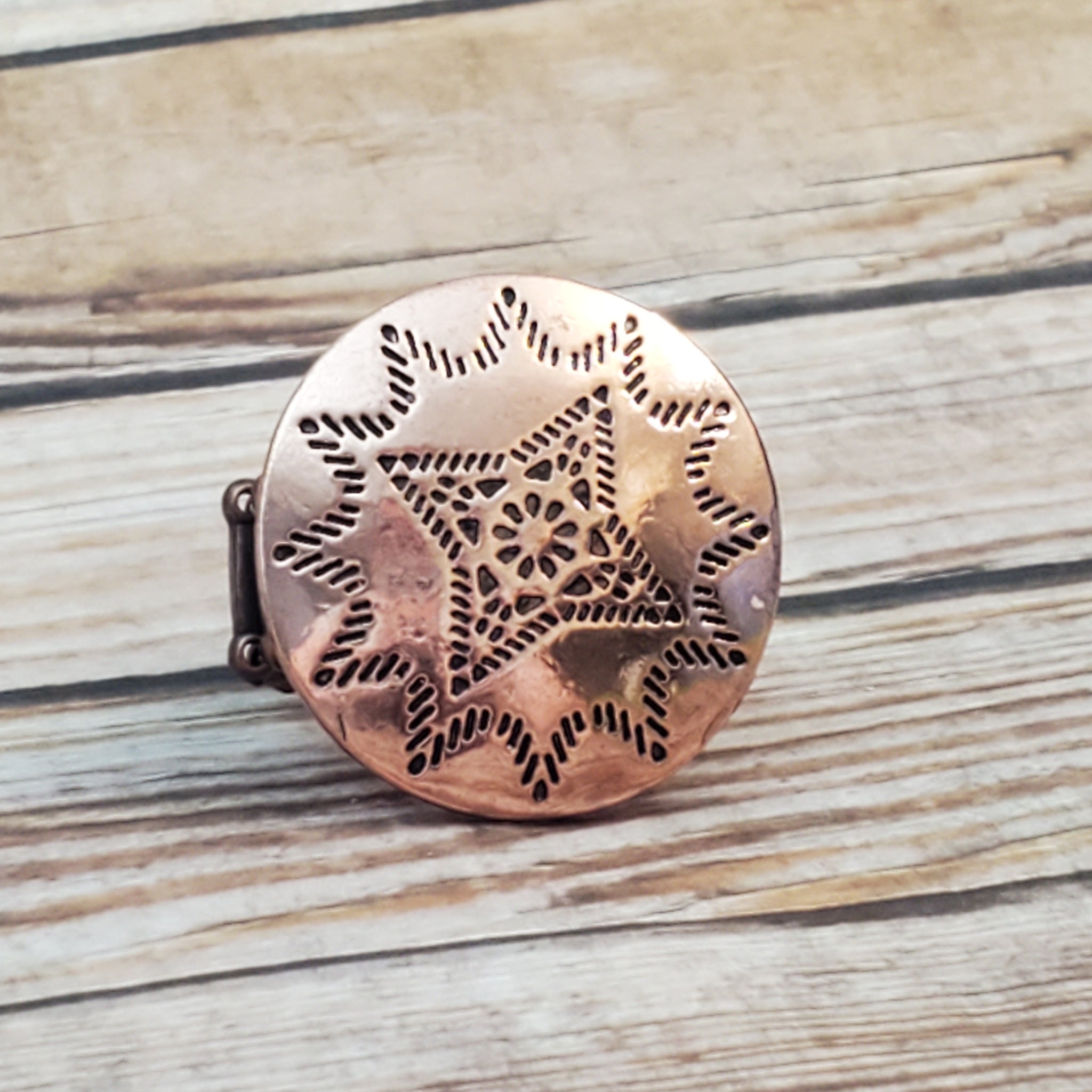Dotted in a radiant sunburst pattern, a shiny copper frame spins atop the finger for a seasonal look. Features a stretchy band for a flexible fit.