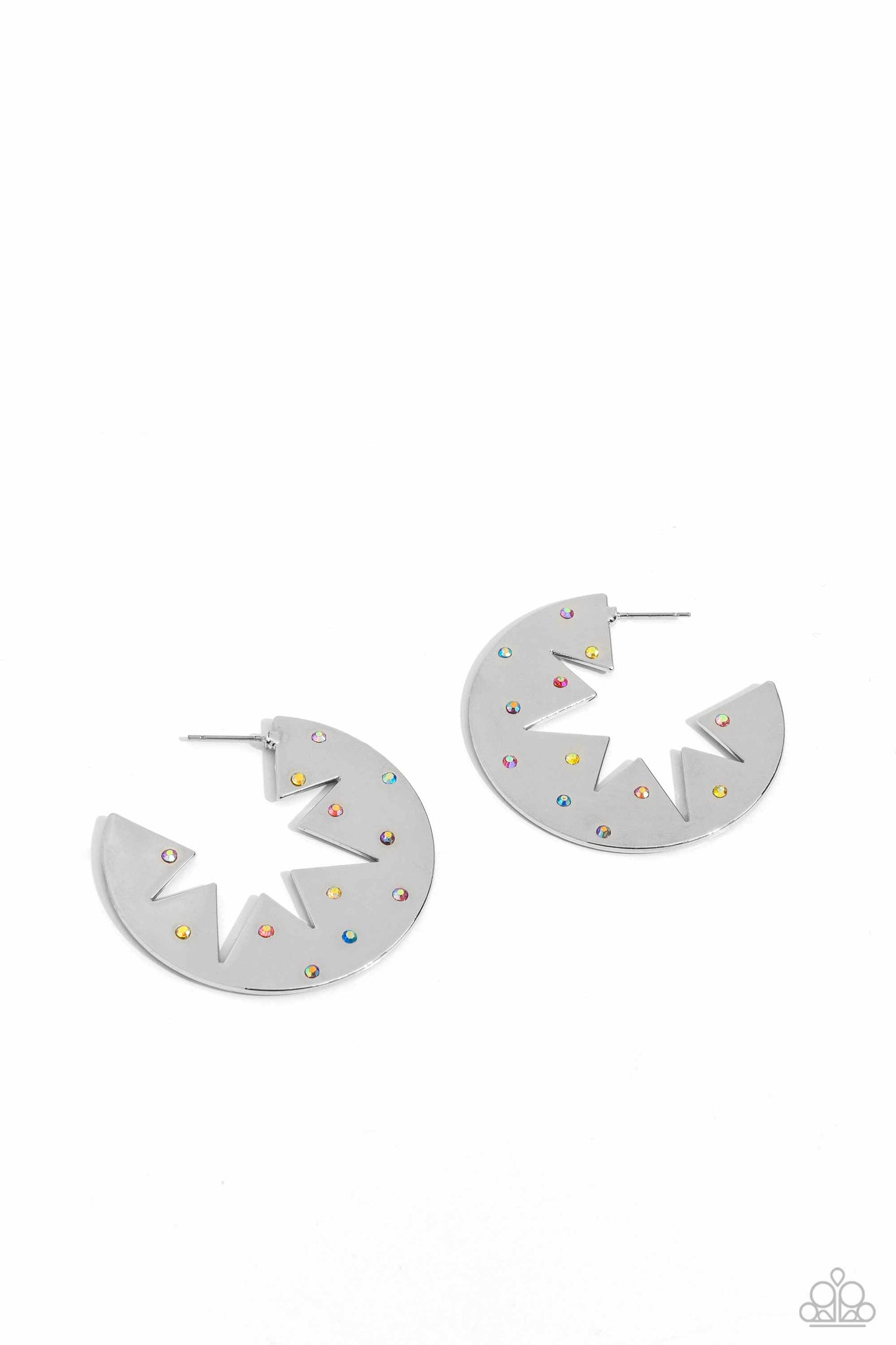 Sporadically dotted with various multicolored and iridescent rhinestones, a three-dimensional star outline explodes from the center of a polished silver disc for an out-of-this-world centerpiece. Earring attaches to a standard post fitting. Hoop measures approximately 1 3/4" in diameter. Due to its prismatic palette, color may vary.