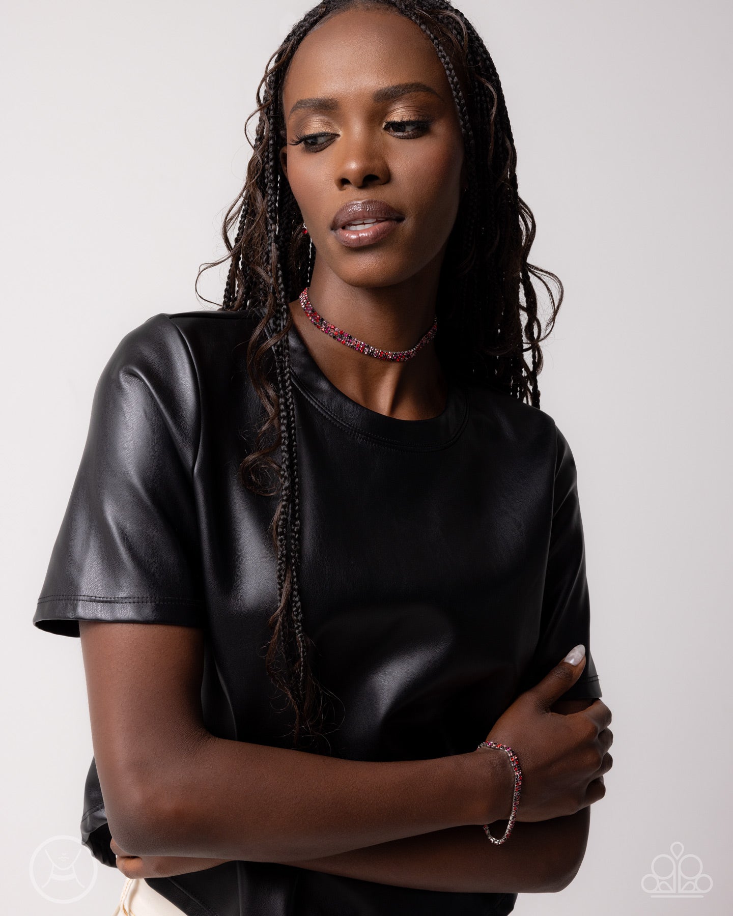 Featuring sleek square fittings, strands of glittery red multicolored crystal-like and faceted rhinestones coalesce into a regal display around the neck. Features an adjustable clasp closure.