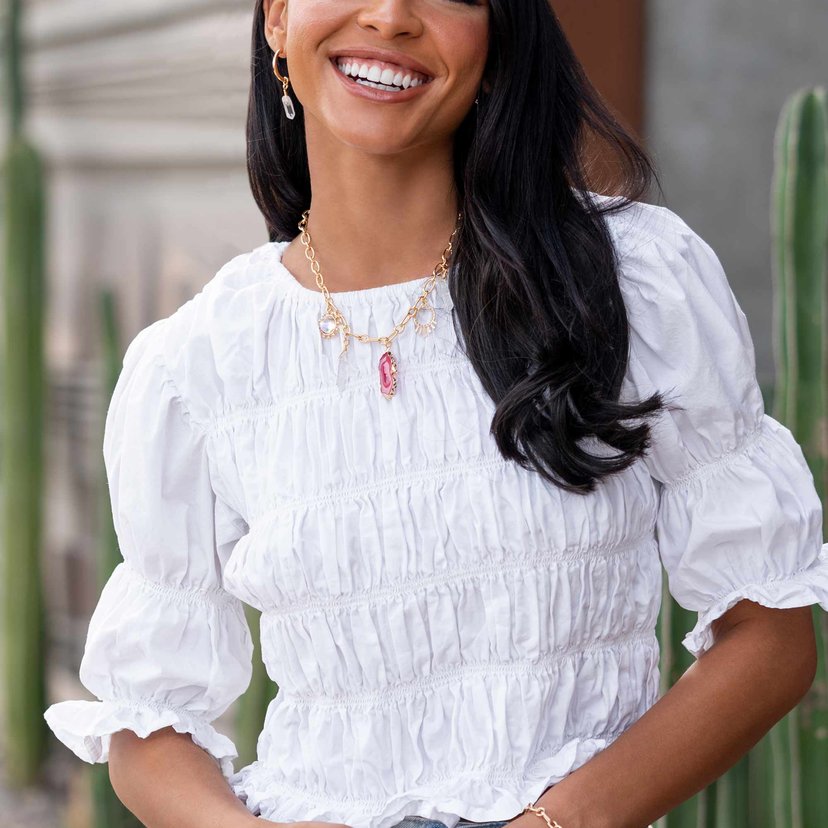 Delicately attached to a gold wire, a chiseled piece of clear white stone twists along a gold paperclip chain around the wrist, creating a decadently earthy centerpiece. Features an adjustable clasp closure.