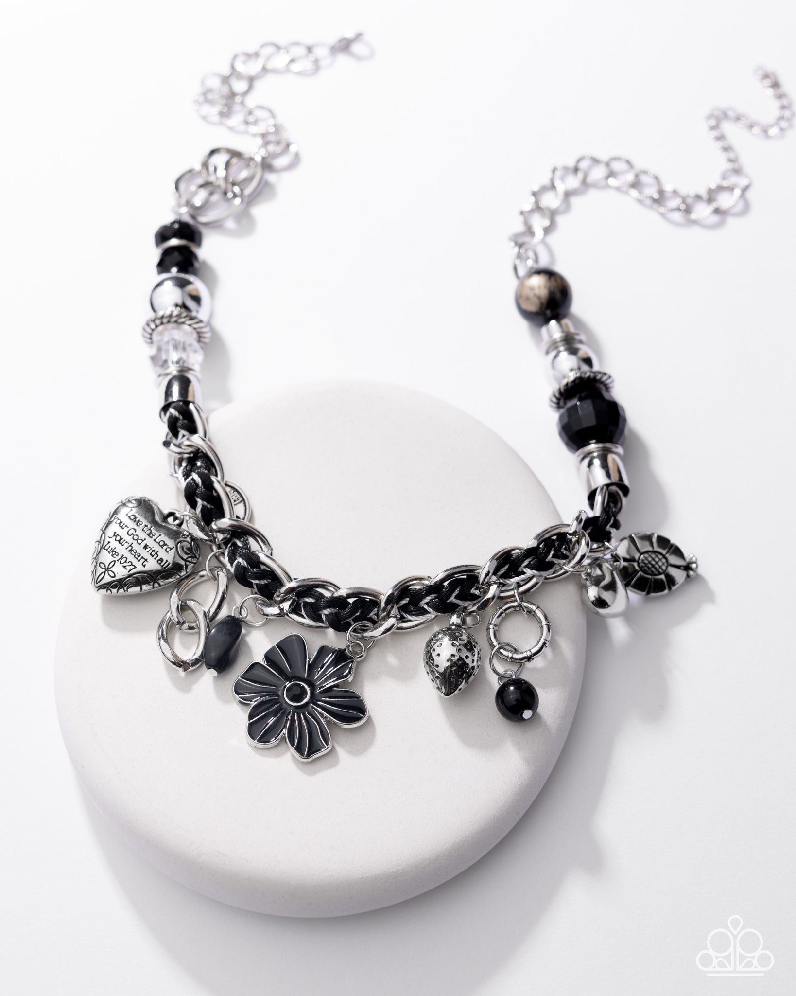Black and ivory cording is braided through a chunky silver chain. A unique variety of charms decorate the piece including a delicate flower and a heart. Heart is inscribed with the phrase "With All My Heart" on one side and a short bible verse on the other that reads, "Love the Lord thy God with all your heart. Luke 10:27." Features an adjustable clasp closure.
