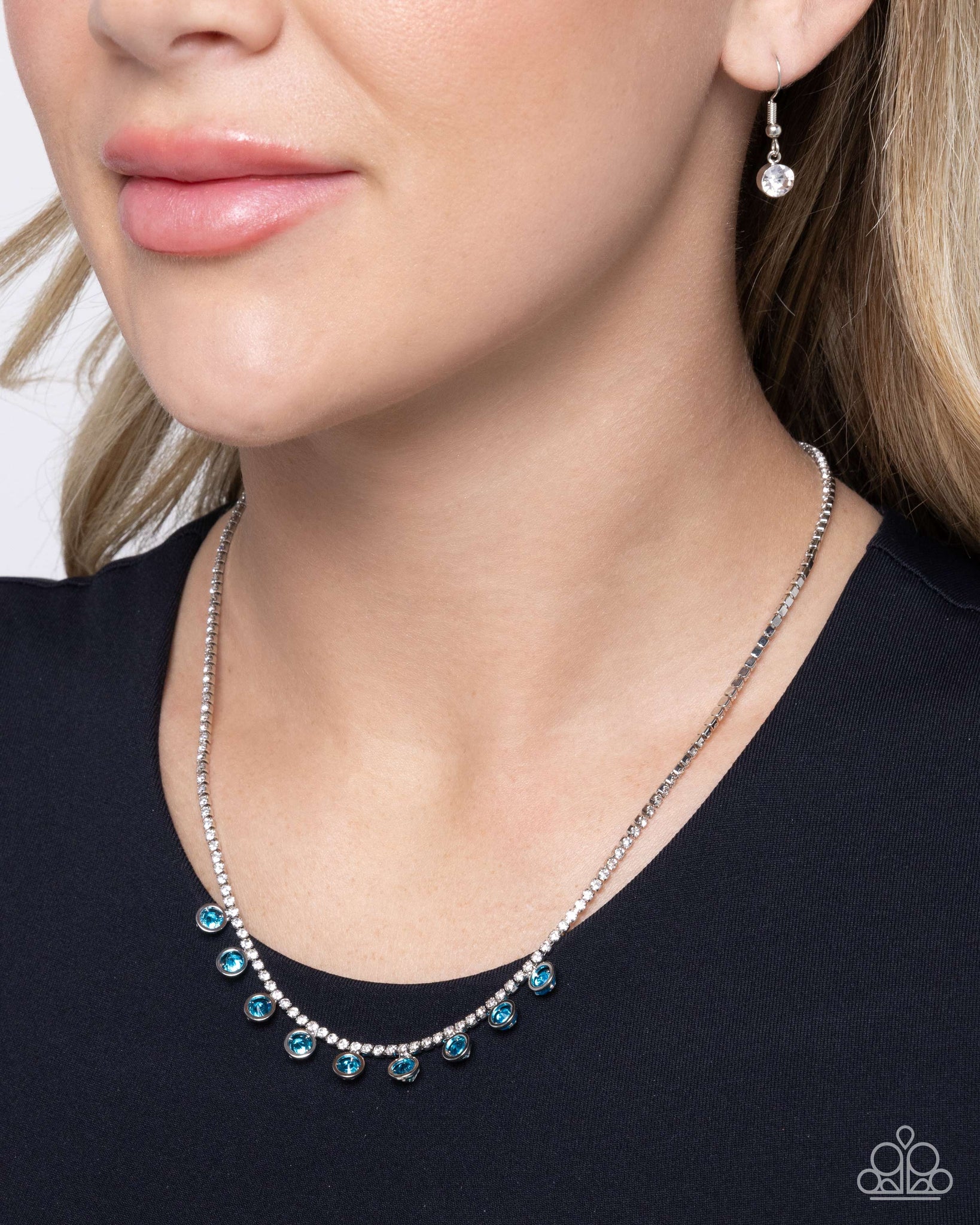 Infused along silver square fittings, dainty white rhinestones glimmer around the collar for a dainty dazzling display. Encased in round, airy silver fittings, a collection of faceted light blue cubic zirconia kiss the bottom curve of the shimmery chain for additional light-catching color and shimmer. Features an adjustable clasp closure.