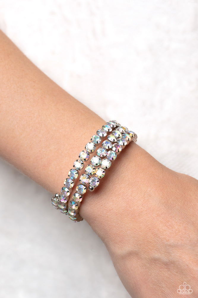 Three glistening rows of iridescent gems, pronged in place by silver fittings, curl along a coiled wire, creating a blinding infinity wrap style bracelet around the wrist. Due to its prismatic palette, color may vary.