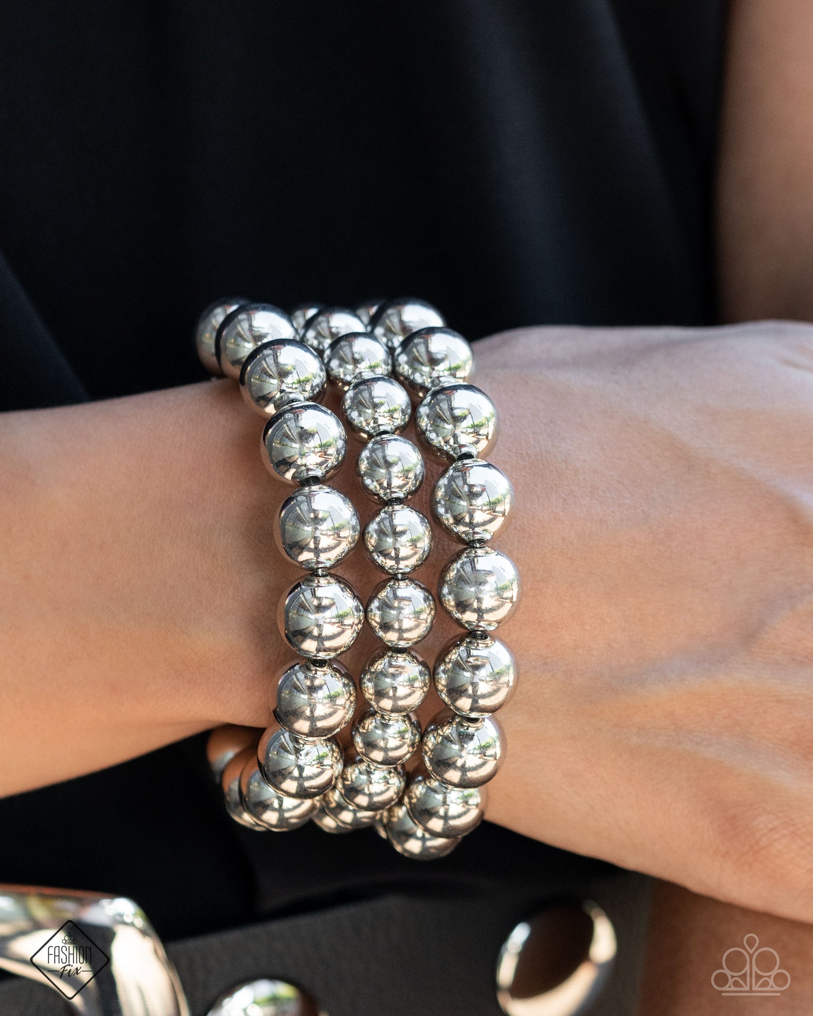 Varying sizes of lustrous silver beads are threaded along a wire that curves and spins around the wrist, creating an edgy, bold infinity wrap-style bracelet.