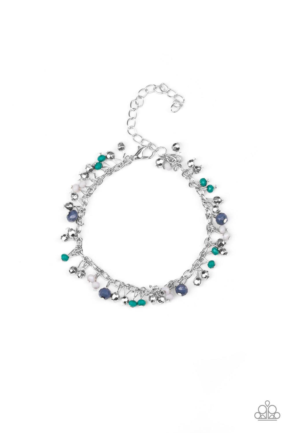 A variety of faceted Arcadia, Sailor Blue, and Harbor Mist beads swing from a shimmery silver chain, creating a flirtatious fringe around the wrist. Faceted silver beads trickle between the colorful beads, adding a hint of shimmer to the seasonal design. Features an adjustable clasp closure.