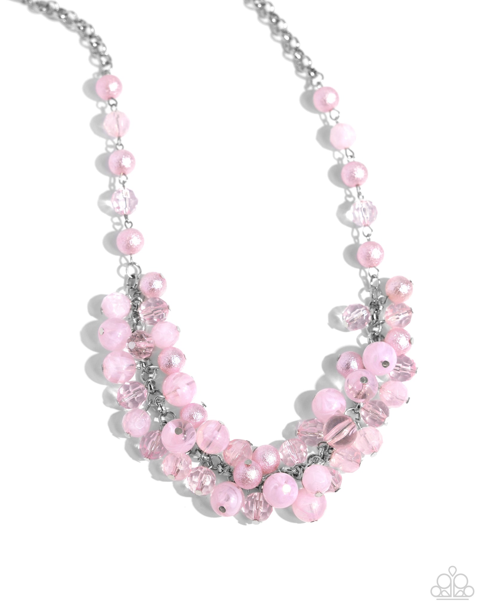 Infused along a classic silver chain, faceted baby pink beads in various opacities, and shimmer cascade in a capricious pattern around the neckline. Features an adjustable clasp closure.