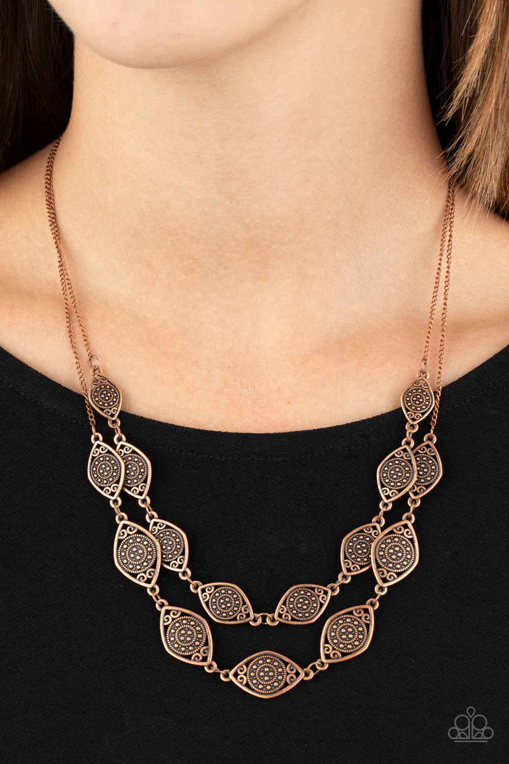 Featuring ornate copper centers, marquise shaped frames link into two rows below the collar for a rustic look. Features an adjustable clasp closure.