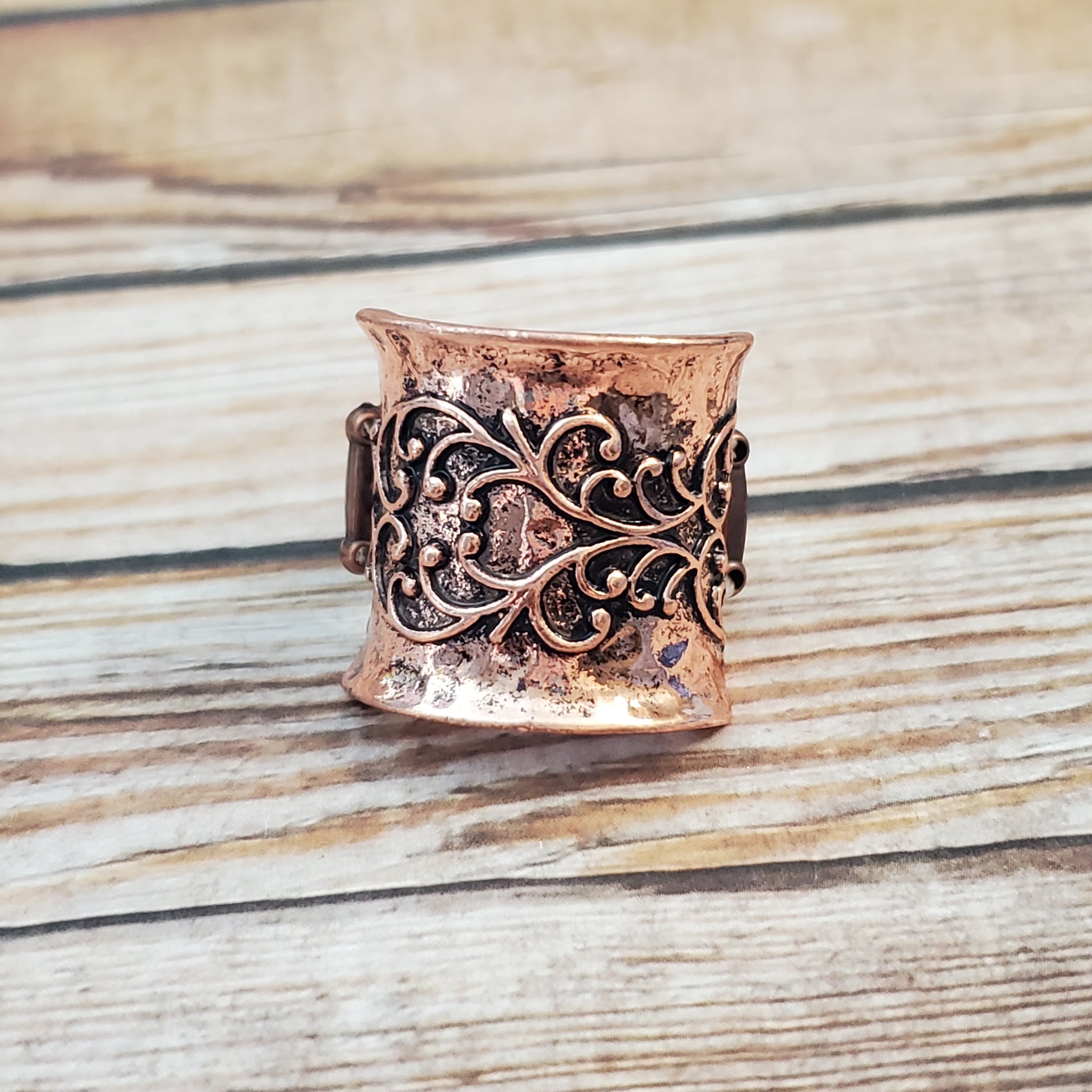 Vine-like copper filigree branches out across the front of an antiqued copper band, creating a seasonal centerpiece. Features a stretchy band for a flexible fit.