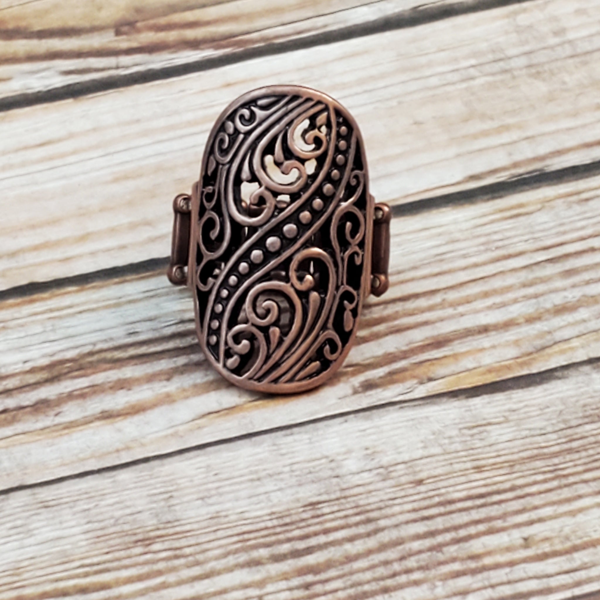 Featuring an antiqued copper finish, elegant frills and dotted designs swirl across an airy oval frame creating a blossoming botanical allure atop the finger. Features a stretchy band for a flexible fit.