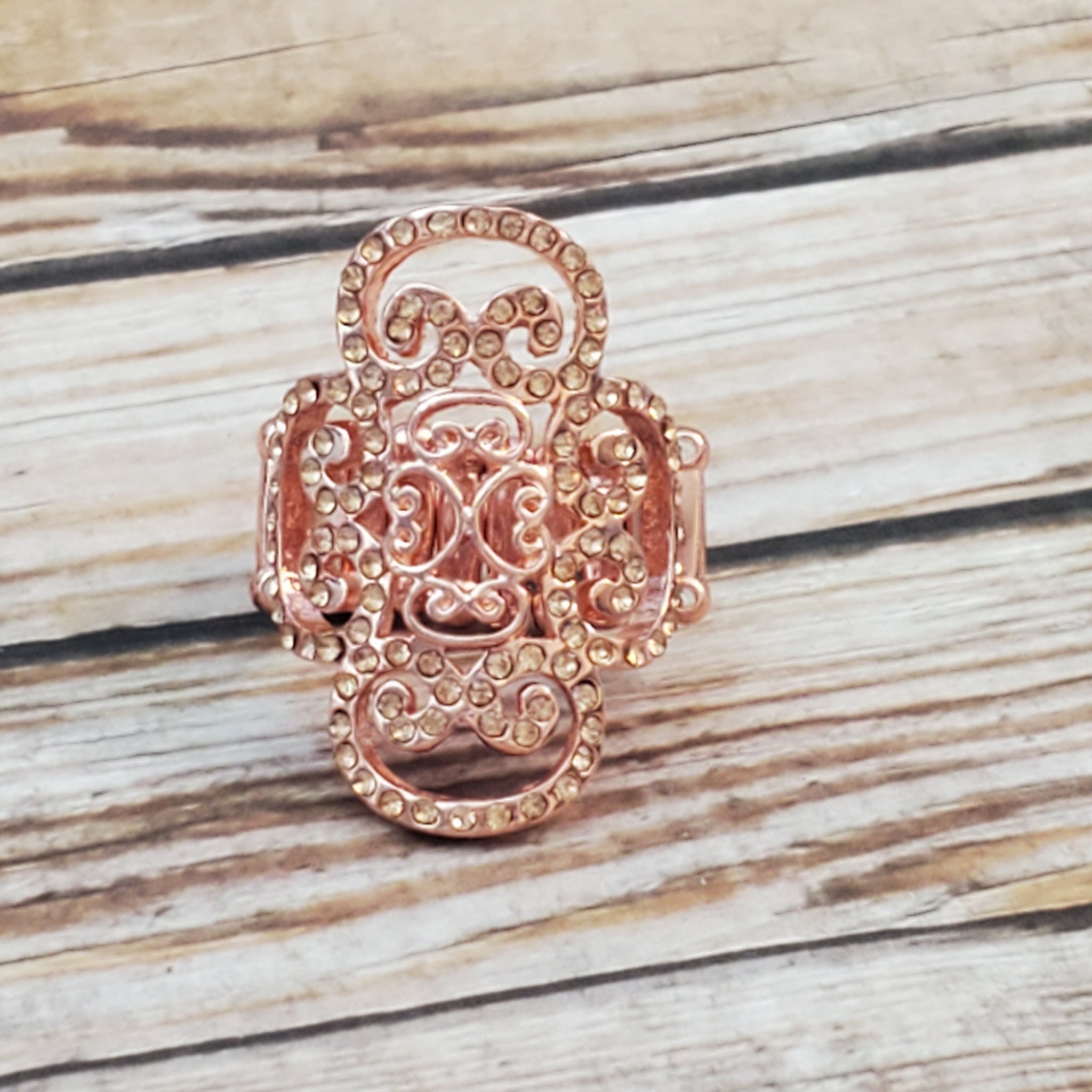 Dainty peach rhinestones are encrusted along a shiny copper frame radiating with regal filigree for a refined look. Features a stretchy band for a flexible fit.